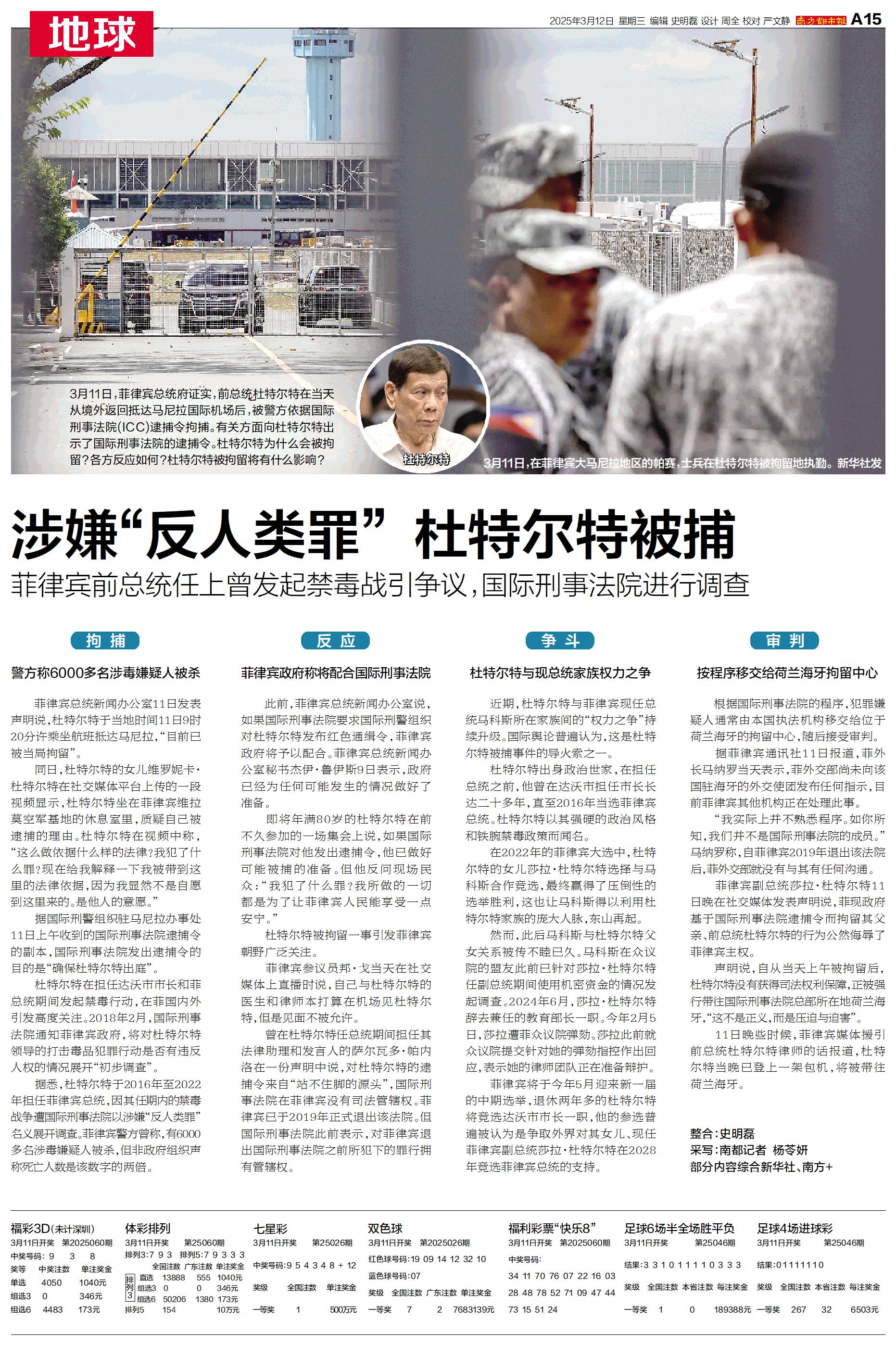 3月11日,菲律宾总统府证实,前总统杜特尔特在当天从境外返回抵达马尼拉国际机场后,被警方依据国际刑事法院(ICC)逮捕令拘捕。有关方面向杜特尔特出示了国际刑事法院的逮捕令。杜特尔特为什么会被拘留?各方反应如何?杜特尔特被拘留将有什么影响?