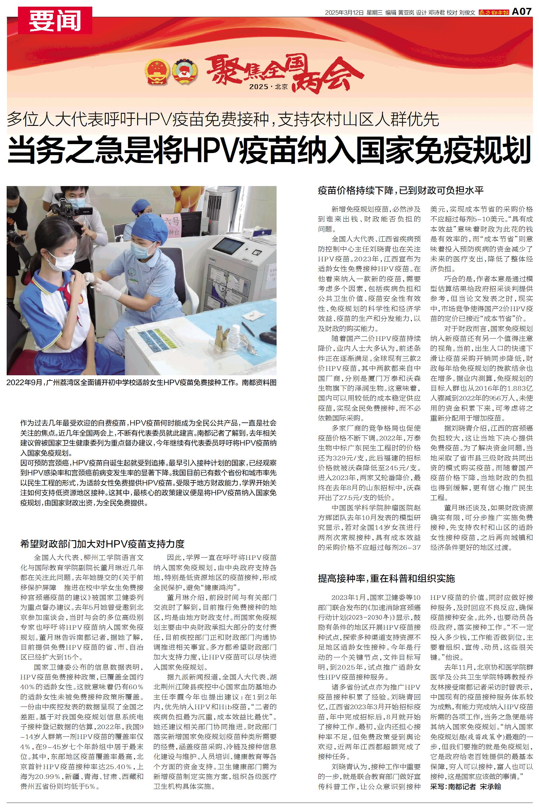 当务之急是将HPV疫苗纳入国家免疫规划