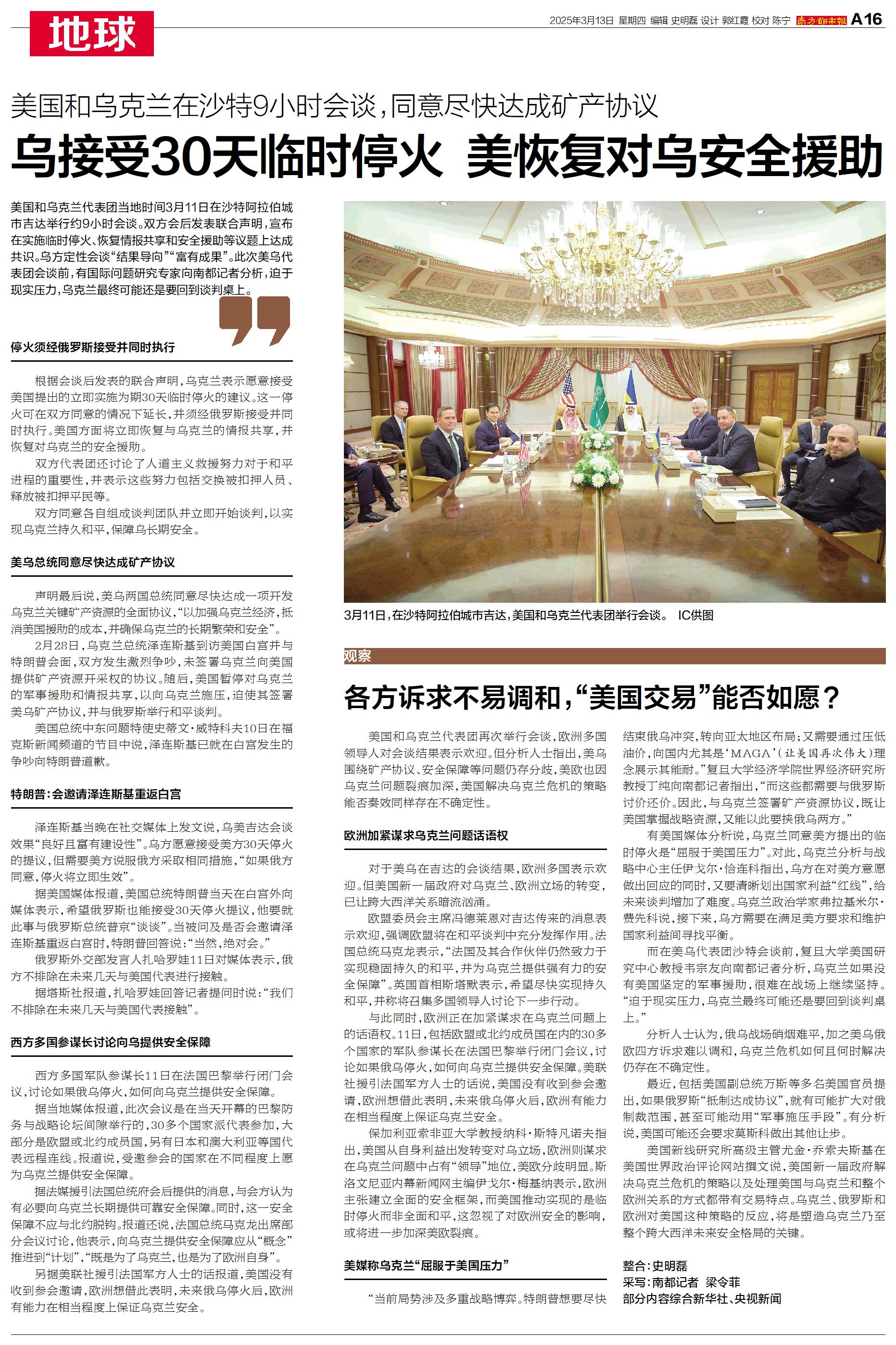 泽连斯基当晚在社交媒体上发文说,乌美吉达会谈效果“良好且富有建设性”。乌方愿意接受美方30天停火的提议,但需要美方说服俄方采取相同措施,“如果俄方同意,停火将立即生效”。