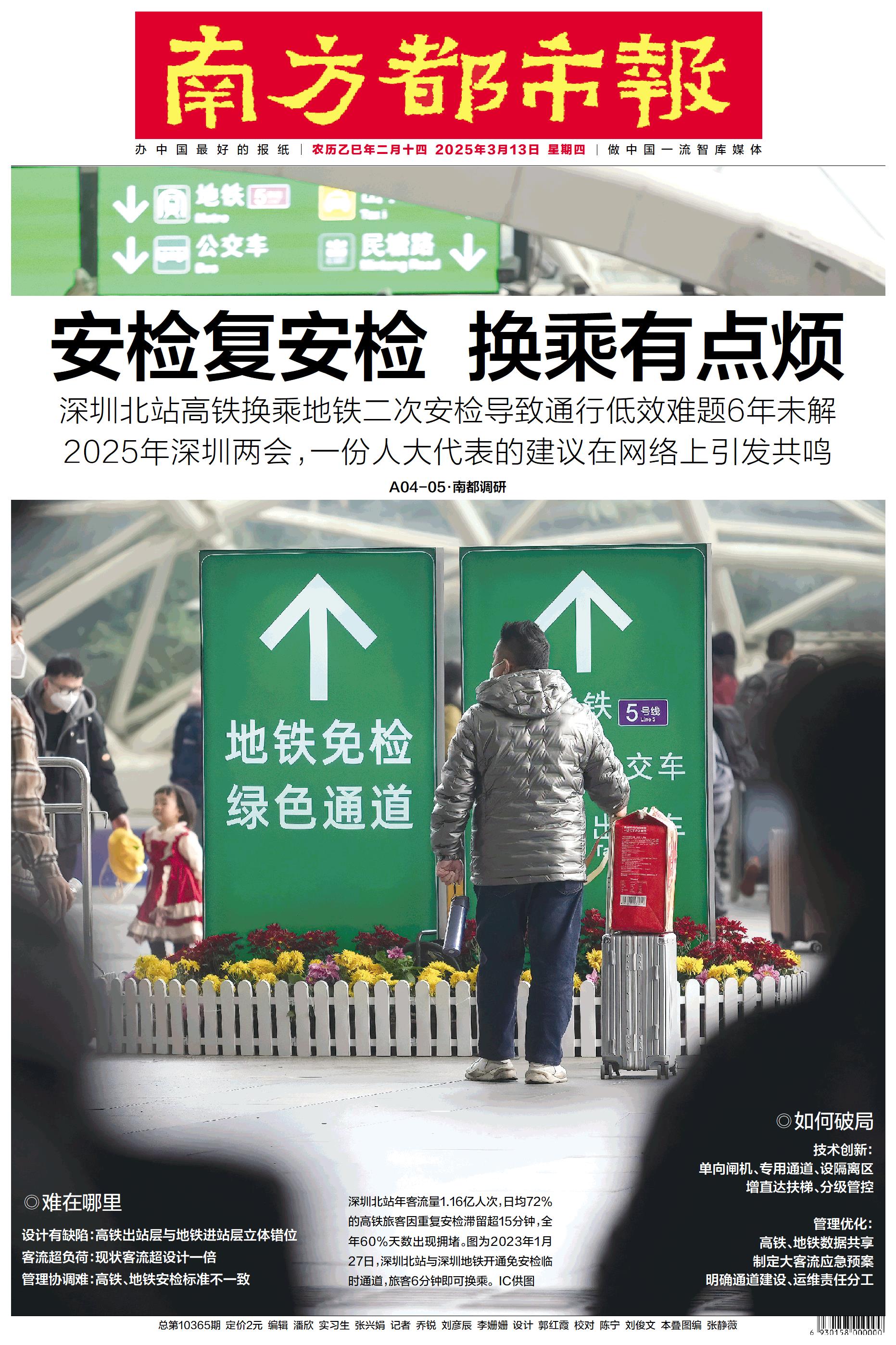 深圳北站年客流量1.16亿人次,日均72%的高铁旅客因重复安检滞留超15分钟,全年60%天数出现拥堵。图为2023年1月27日,深圳北站与深圳地铁开通免安检临时通道,旅客6分钟即可换乘。 IC供图