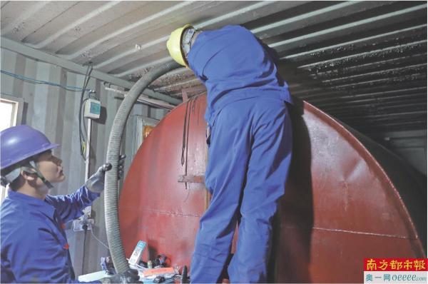 10时30分许,工作人员调派专业公司加油车,抽取现场油库的柴油。其中集装箱内藏有一个巨大油罐。