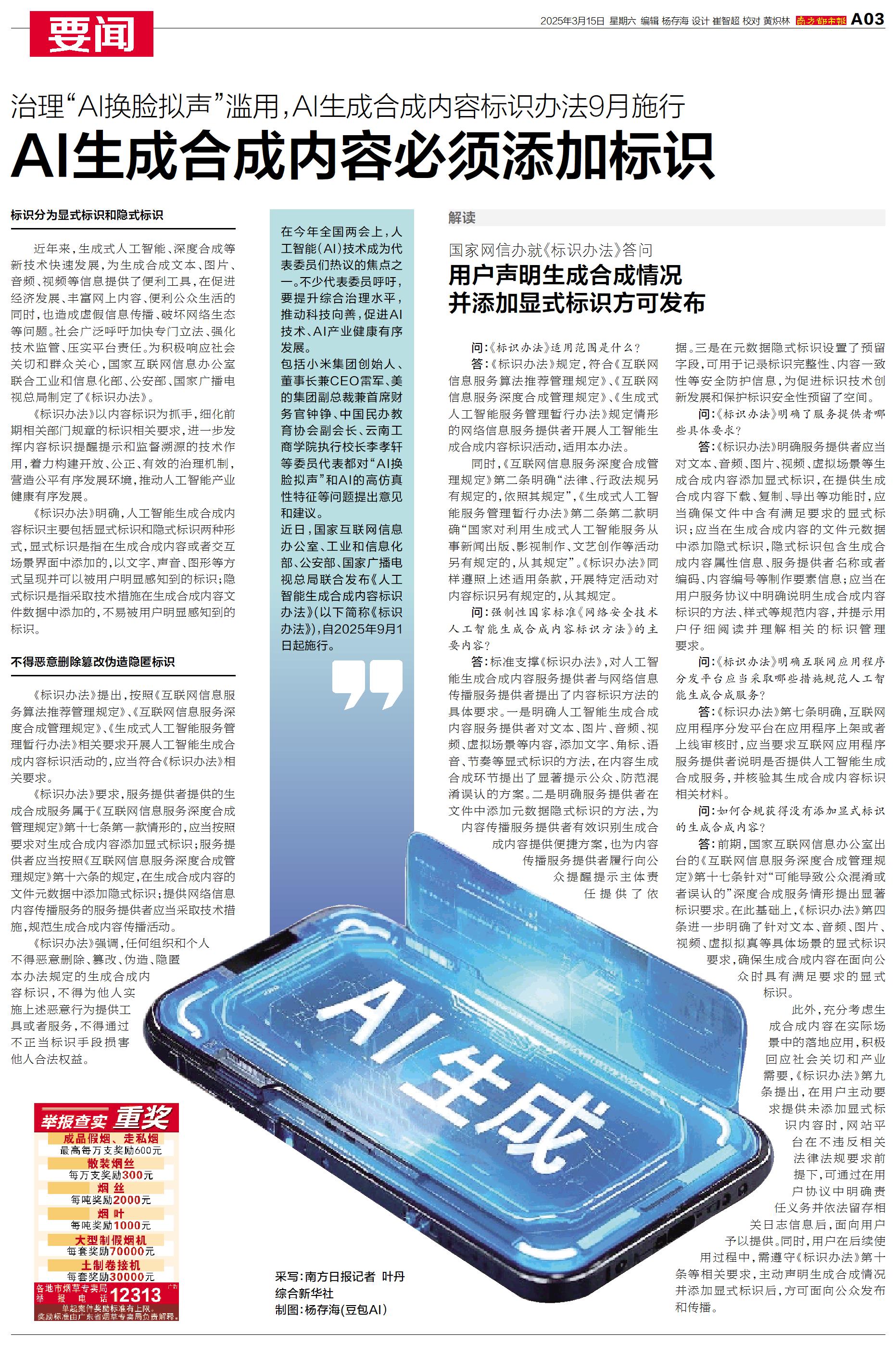 近日,国家互联网信息办公室、工业和信息化部、公安部、国家广播电视总局联合发布《人工智能生成合成内容标识办法》,自2025年9月1日起施行。