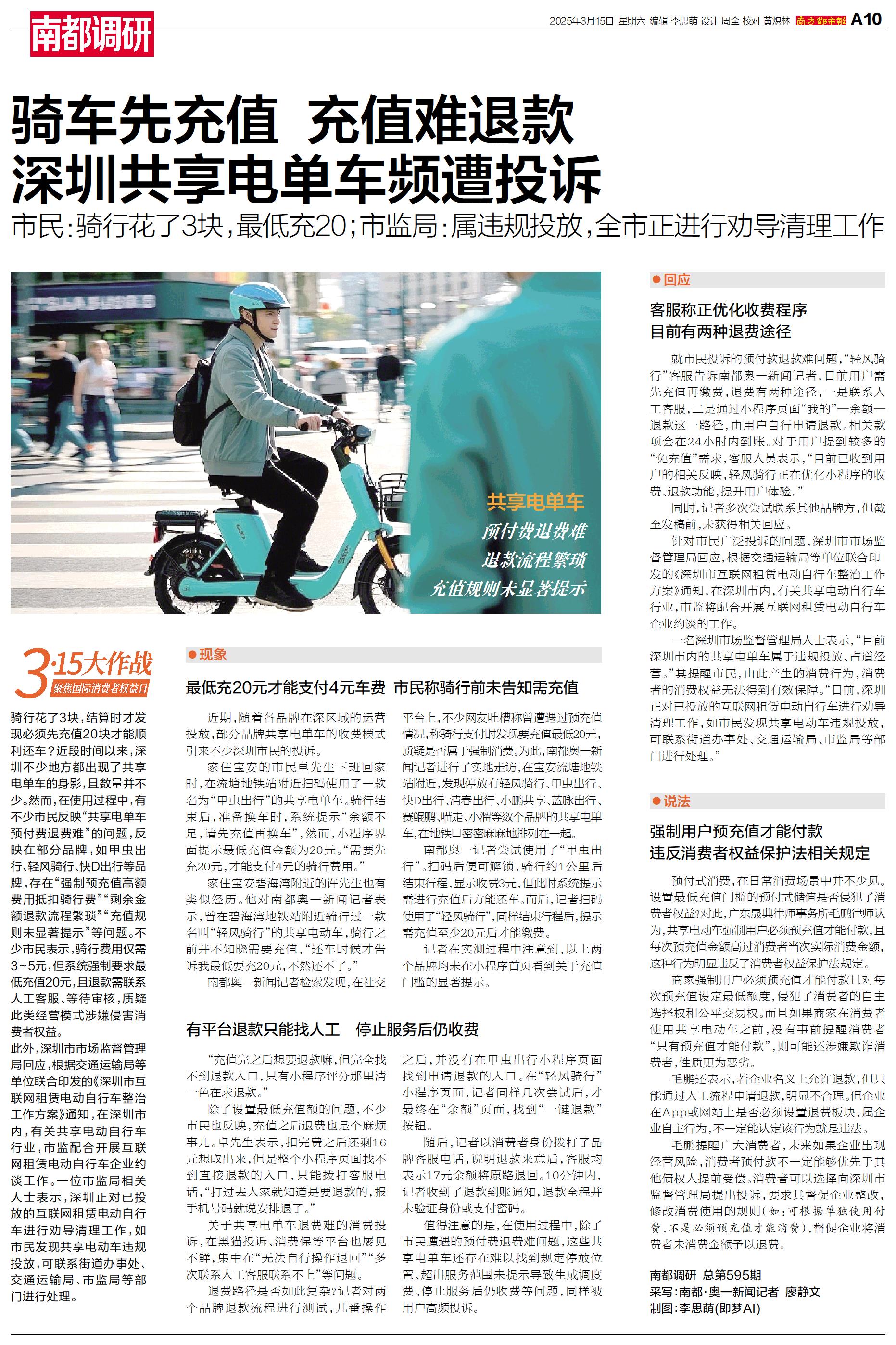 骑车先充值 充值难退款 深圳共享电单车频遭投诉