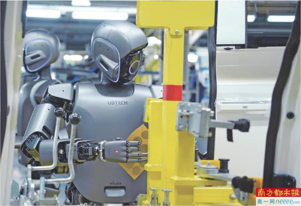 优必选工业人形机器人“群体智能”在极氪5G智慧工厂开展协同实训。 南方日报记者 朱洪波 通讯员 罗艳 摄