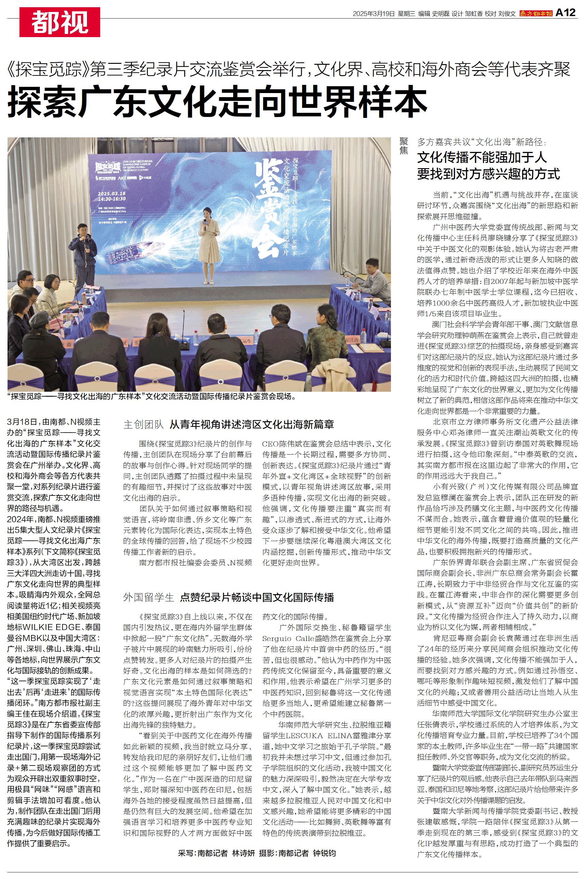 3月18日,由南都、N视频主办的“探宝觅踪——寻找文化出海的广东样本”文化交流活动暨国际传播纪录片鉴赏会在广州举办。文化界、高校和海外商会等各方代表共聚一堂,对系列纪录片进行鉴赏交流,探索广东文化走向世界的路径与机遇。