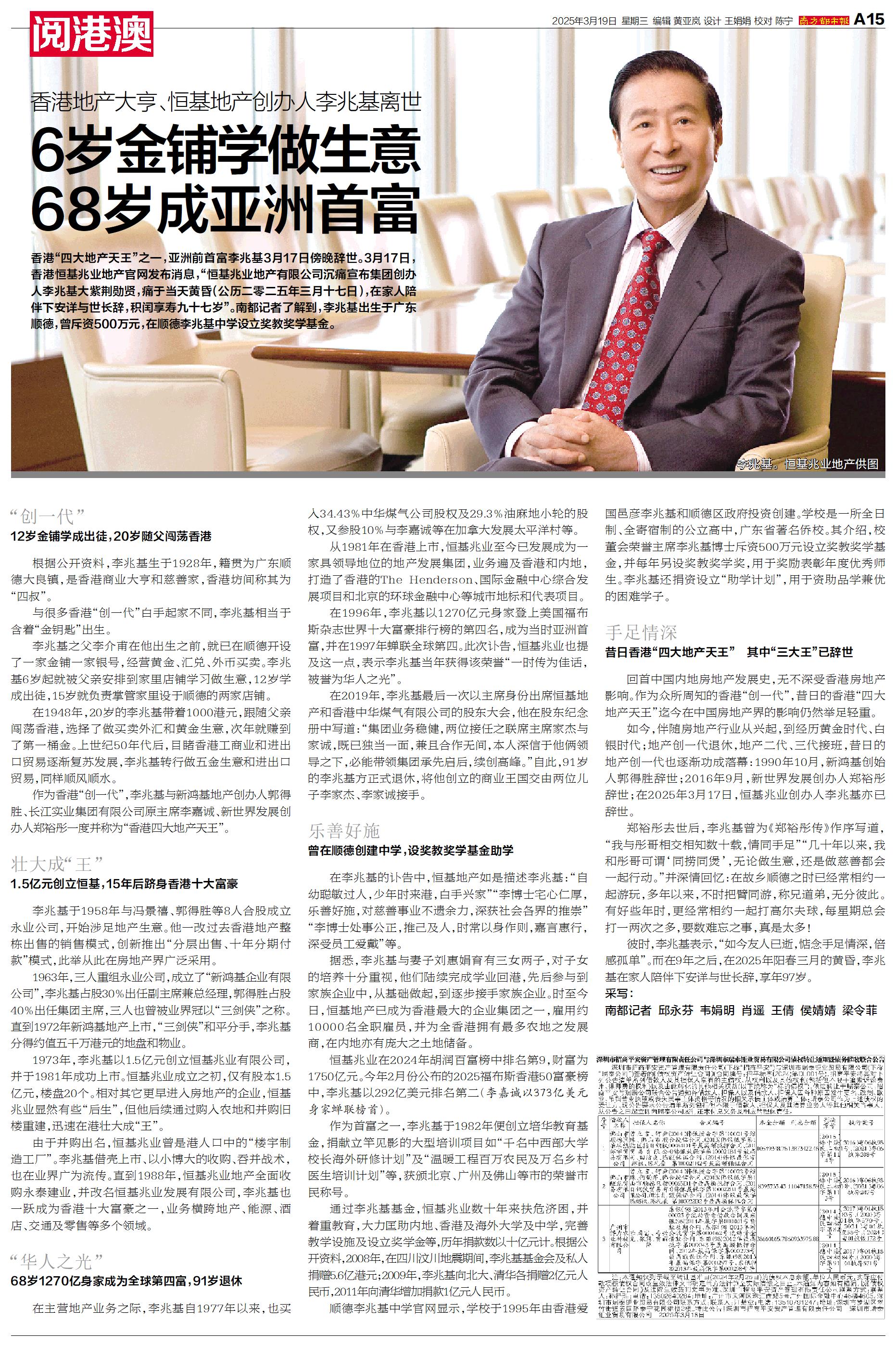 香港“四大地产天王”之一,亚洲前首富李兆基3月17日傍晚辞世。3月17日,香港恒基兆业地产官网发布消息,“恒基兆业地产有限公司沉痛宣布集团创办人李兆基大紫荆勋贤,痛于当天黄昏(公历二零二五年三月十七日),在家人陪伴下安详与世长辞,积闰享寿九十七岁”。南都记者了解到,李兆基出生于广东顺德,曾斥资500万元,在顺德李兆基中学设立奖教奖学基金。