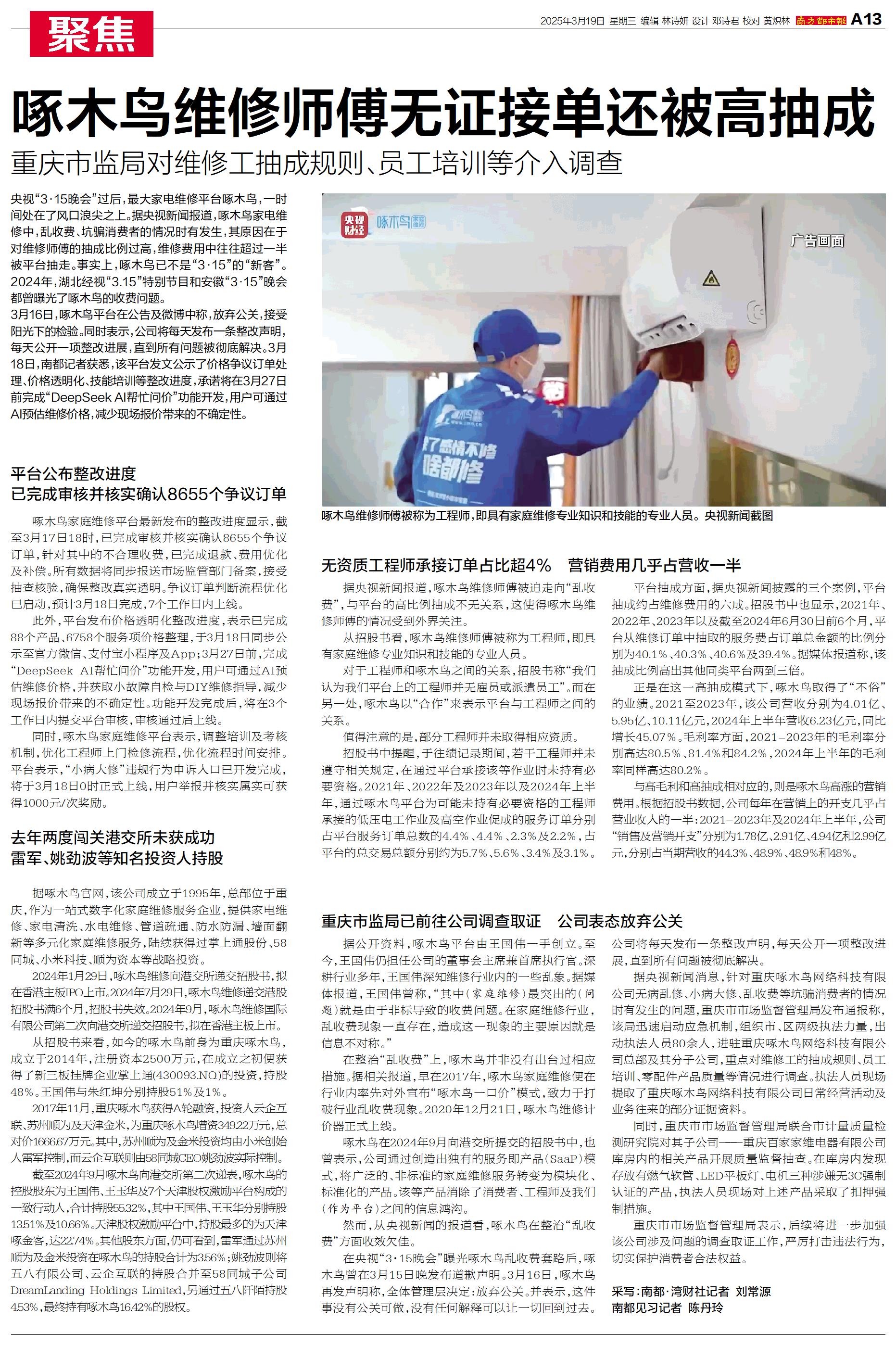 3月16日,啄木鸟平台在公告及微博中称,放弃公关,接受阳光下的检验。同时表示,公司将每天发布一条整改声明,每天公开一项整改进展,直到所有问题被彻底解决。3月18日,南都记者获悉,该平台发文公示了价格争议订单处理、价格透明化、技能培训等整改进度,承诺将在3月27日前完成“DeepSeek AI帮忙问价”功能开发,用户可通过AI预估维修价格,减少现场报价带来的不确定性。