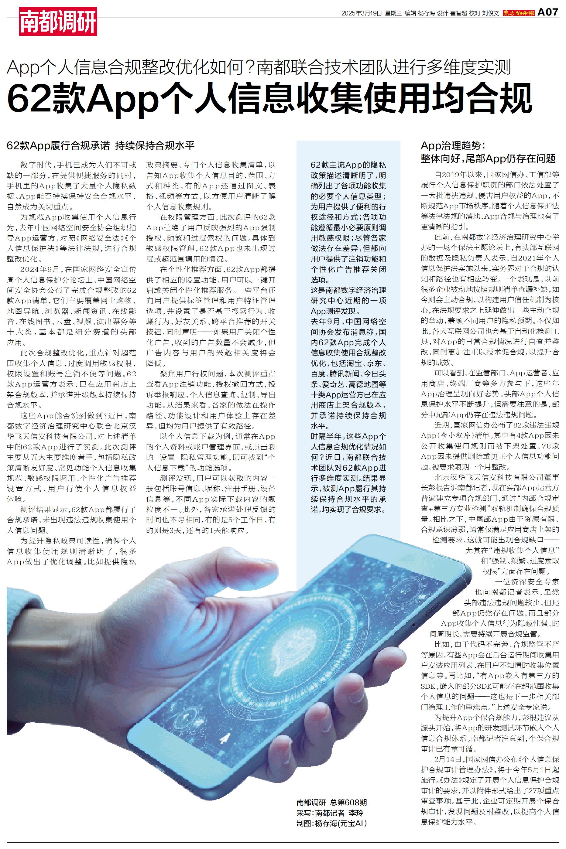 时隔半年,这些App个人信息合规优化情况如何?近日,南都联合技术团队对62款App进行多维度实测。结果显示,被测App履行其持续保持合规水平的承诺,均实现了合规要求。