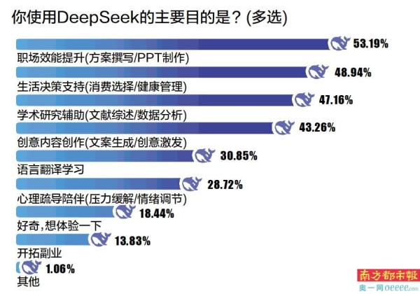 搭上AI快车,年轻人都在指挥DeepSeek做什么?调查结果显示,53.19%的受访青年表示通过DeepSeek来进行职场效能提升,例如方案撰写、PPT制作等。其次是用于生活决策,如消费选择、健康管理,还可以辅助学术研究,比例各占四成以上。值得一提的是,还有近三成受访青年将DeepSeek看作心理疏导陪伴对象,认为起到压力缓解、情绪调节的作用。