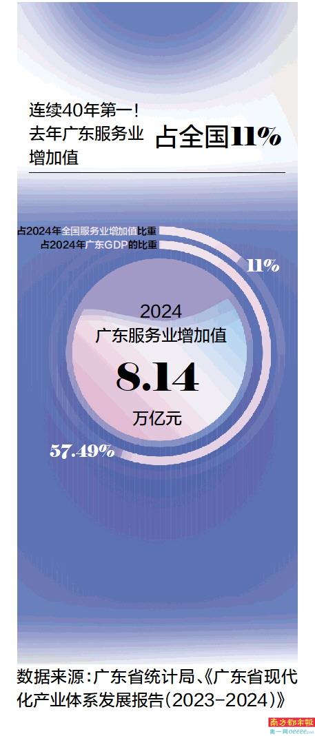 全国最新数据显示,2024年服务业增加值765583亿元,比上年增长5.0%,占全国GDP的比重为56.7%。广东服务业表现也很抢眼,去年全省服务业增加值超8万亿元,占全省GDP的比重为57.49%,贡献了全国约11%的服务业增加值。