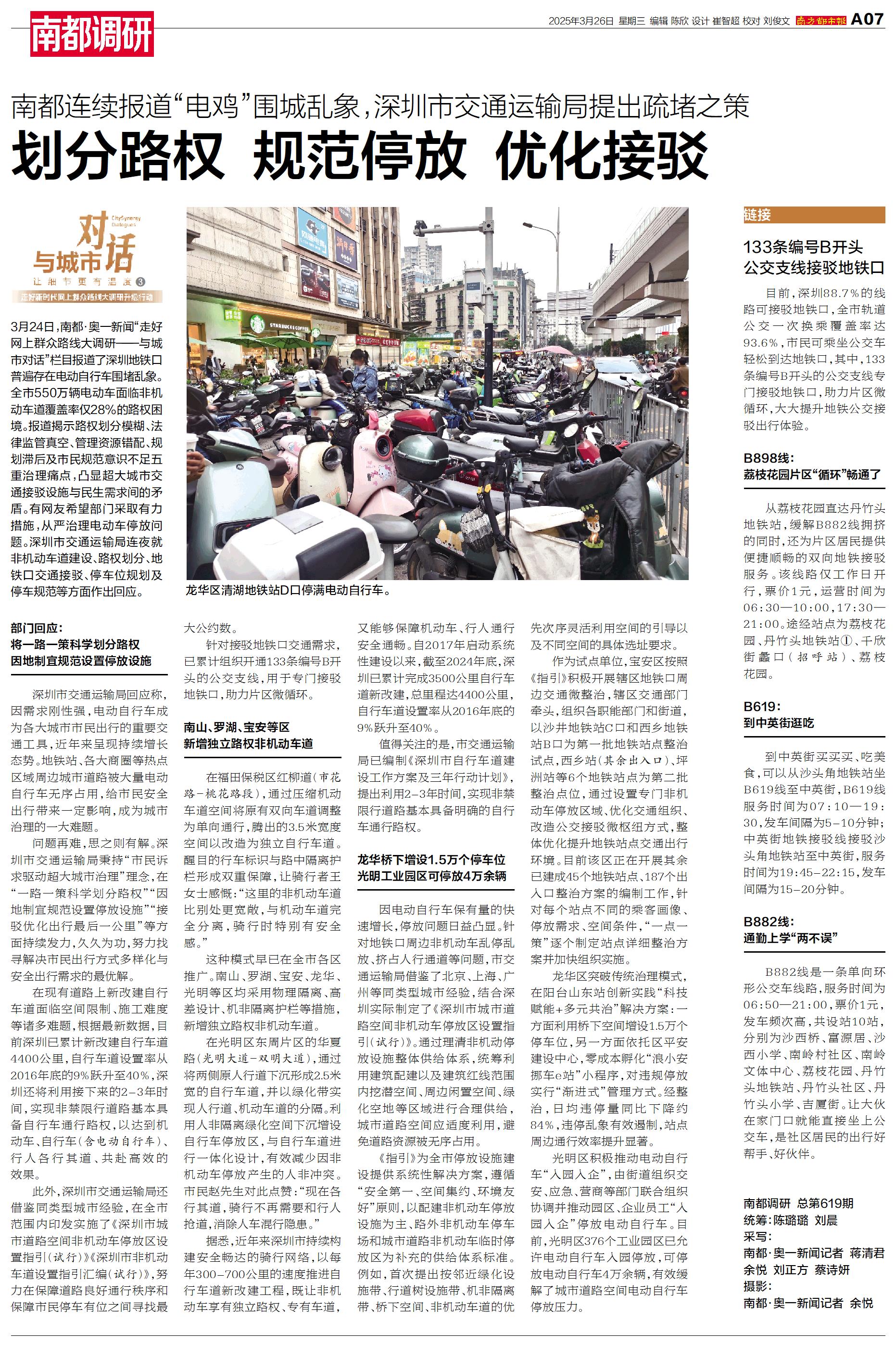3月24日,南都·奥一新闻“走好网上群众路线大调研——与城市对话”栏目报道了深圳地铁口普遍存在电动自行车围堵乱象。