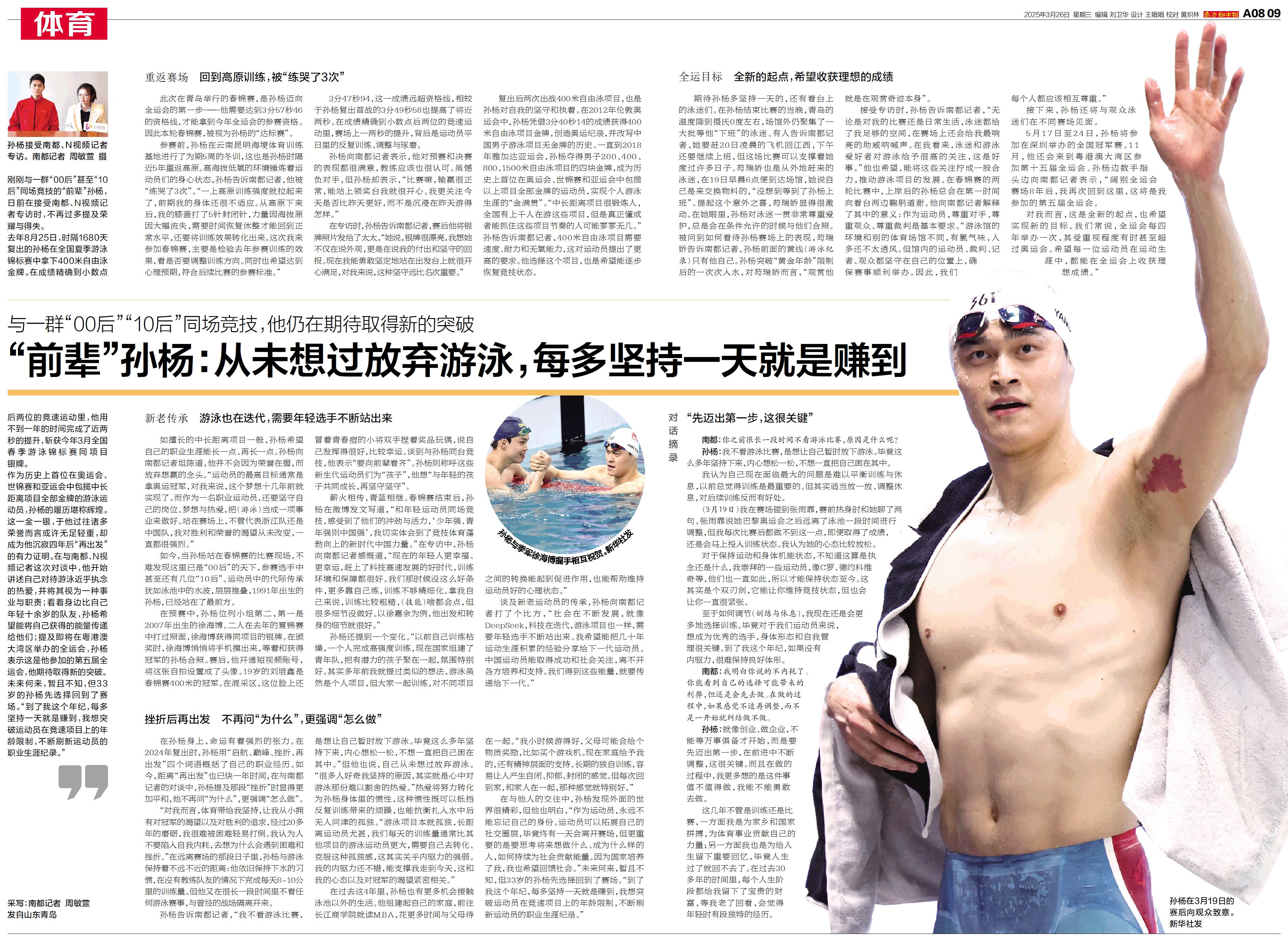 “前辈”孙杨:从未想过放弃游泳,每多坚持一天就是赚到