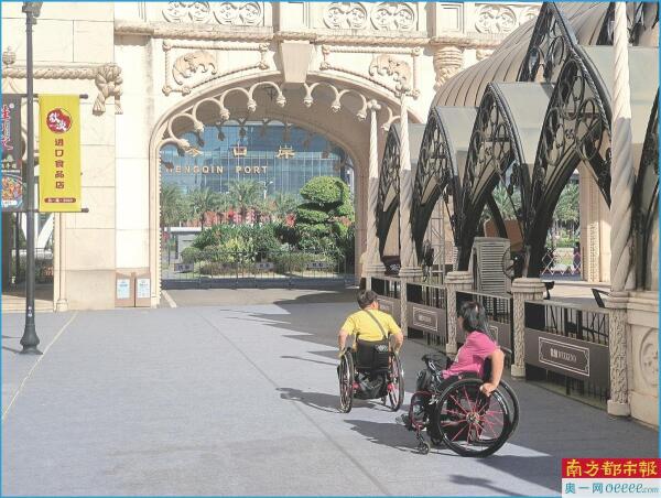行动不便的游客坐轮椅游览励骏庞都广场。