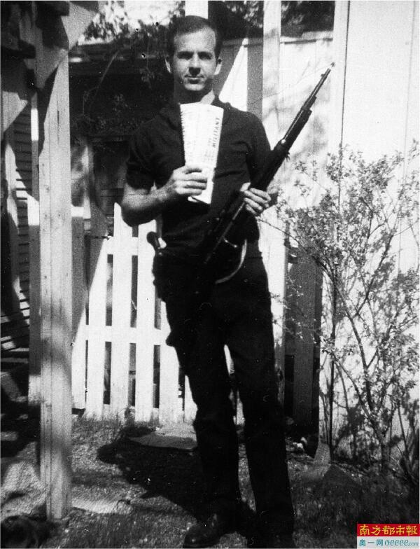 枪手奥斯瓦尔德手持在肯尼迪遇刺案中使用的步枪。这张照片曾在1963年时被送给他的朋友乔治,照片背后有奥斯瓦尔德写下的签名和日期。资料图