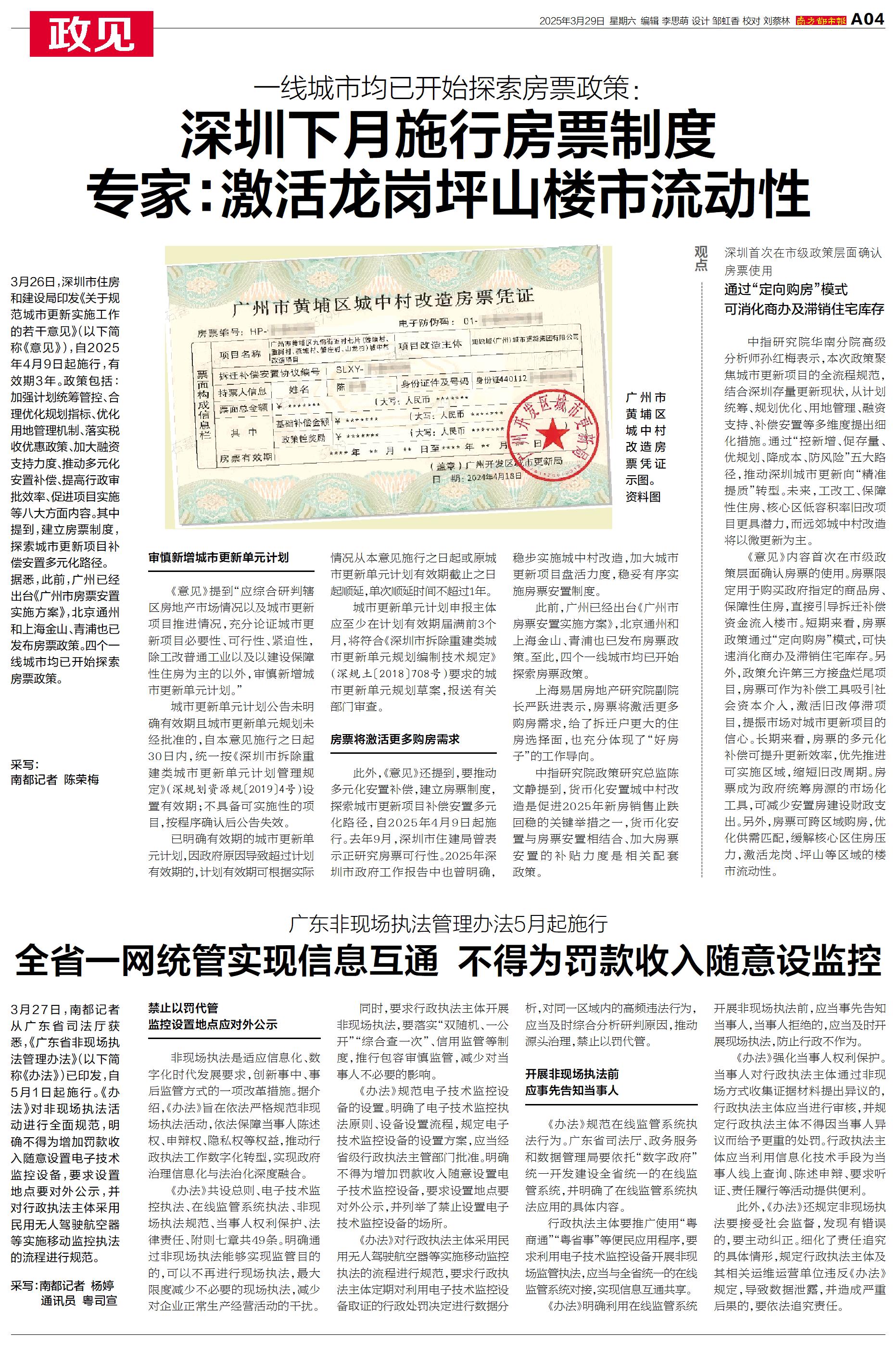 此外,《意见》还提到,要推动多元化安置补偿,建立房票制度,探索城市更新项目补偿安置多元化路径,自2025年4月9日起施行。去年9月,深圳市住建局曾表示正研究房票可行性。2025年深圳市政府工作报告中也曾明确,稳步实施城中村改造,加大城市更新项目盘活力度,稳妥有序实施房票安置制度。