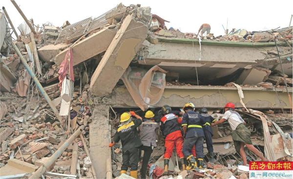 3月30日,救援人员在缅甸曼德勒天空别墅开展救援行动。