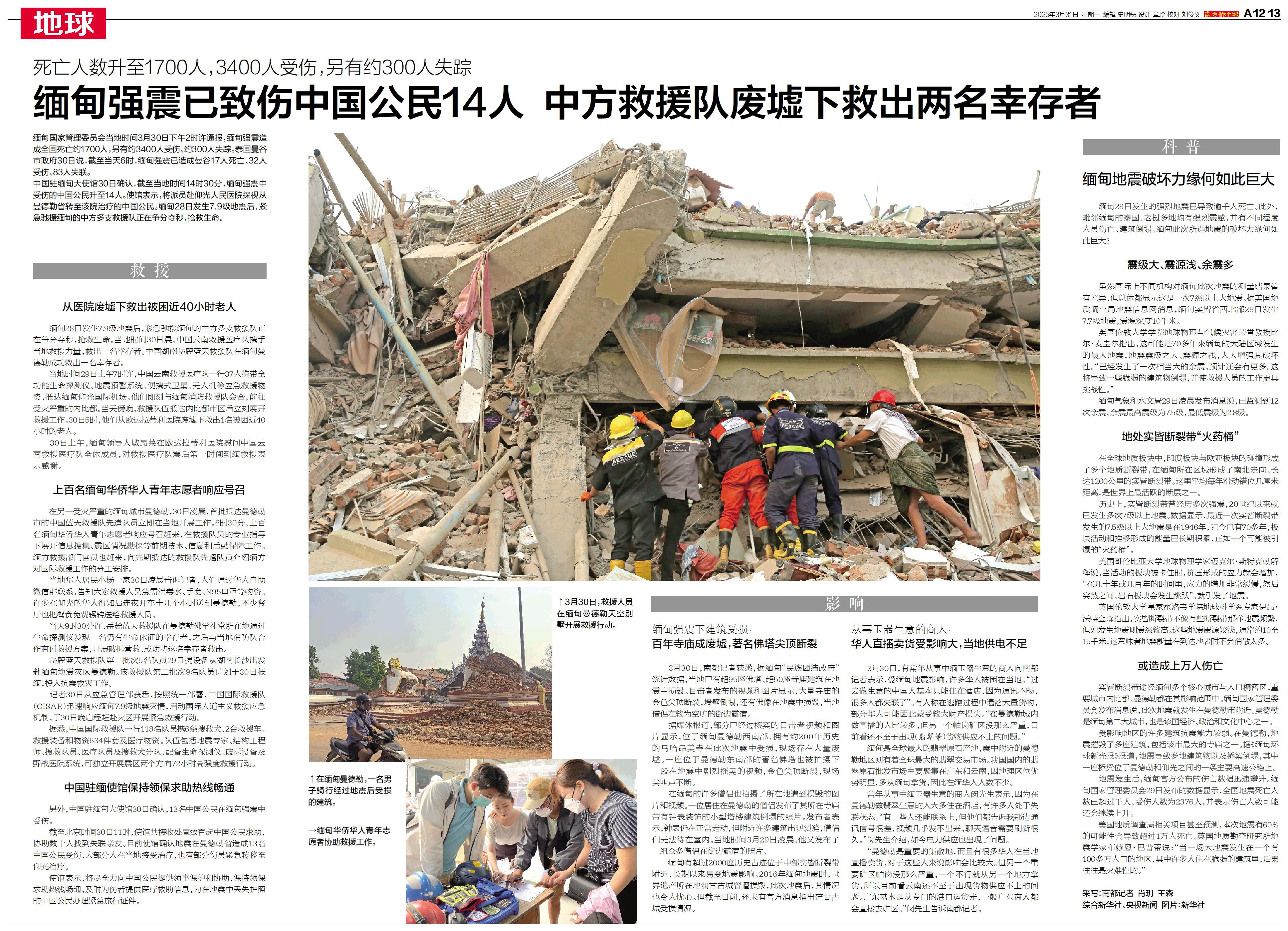 缅甸强震已致伤中国公民14人 中方救援队废墟下救出两名幸存者