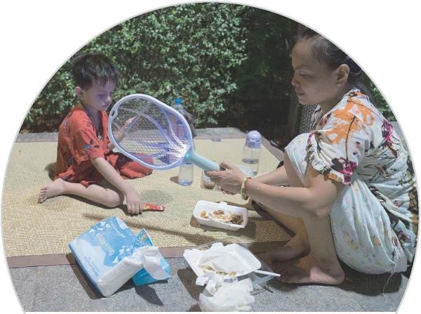 缅甸曼德勒街头,一名女子用电蚊拍为孩子驱赶蚊虫。