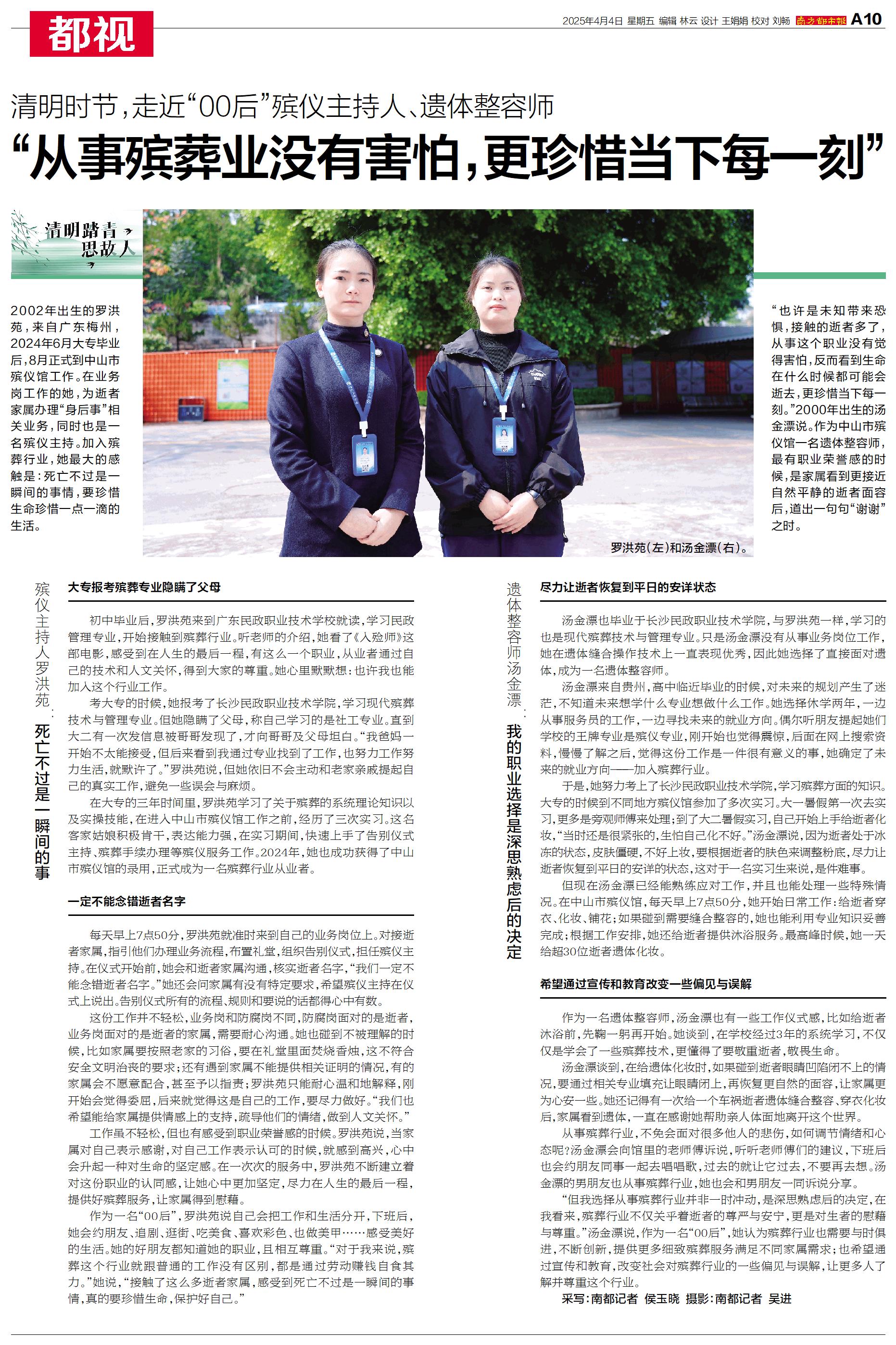 2002年出生的罗洪苑,来自广东梅州,2024年6月大专毕业后,8月正式到中山市殡仪馆工作。在业务岗工作的她,为逝者家属办理“身后事”相关业务,同时也是一名殡仪主持。加入殡葬行业,她最大的感触是:死亡不过是一瞬间的事情,要珍惜生命珍惜一点一滴的生活。