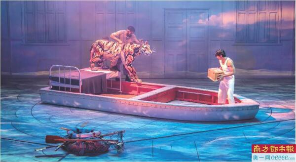 舞台上最震撼的突破,是老虎“理查德·帕克”的诞生。由三位木偶师协同操控的机械老虎,通过透明骨架与精密机关,呈现从扑食到溺水的野性张力。木偶师与角色的呼吸同步,将机械转化为生命,让观众直面“真实与虚构”的哲学边界。