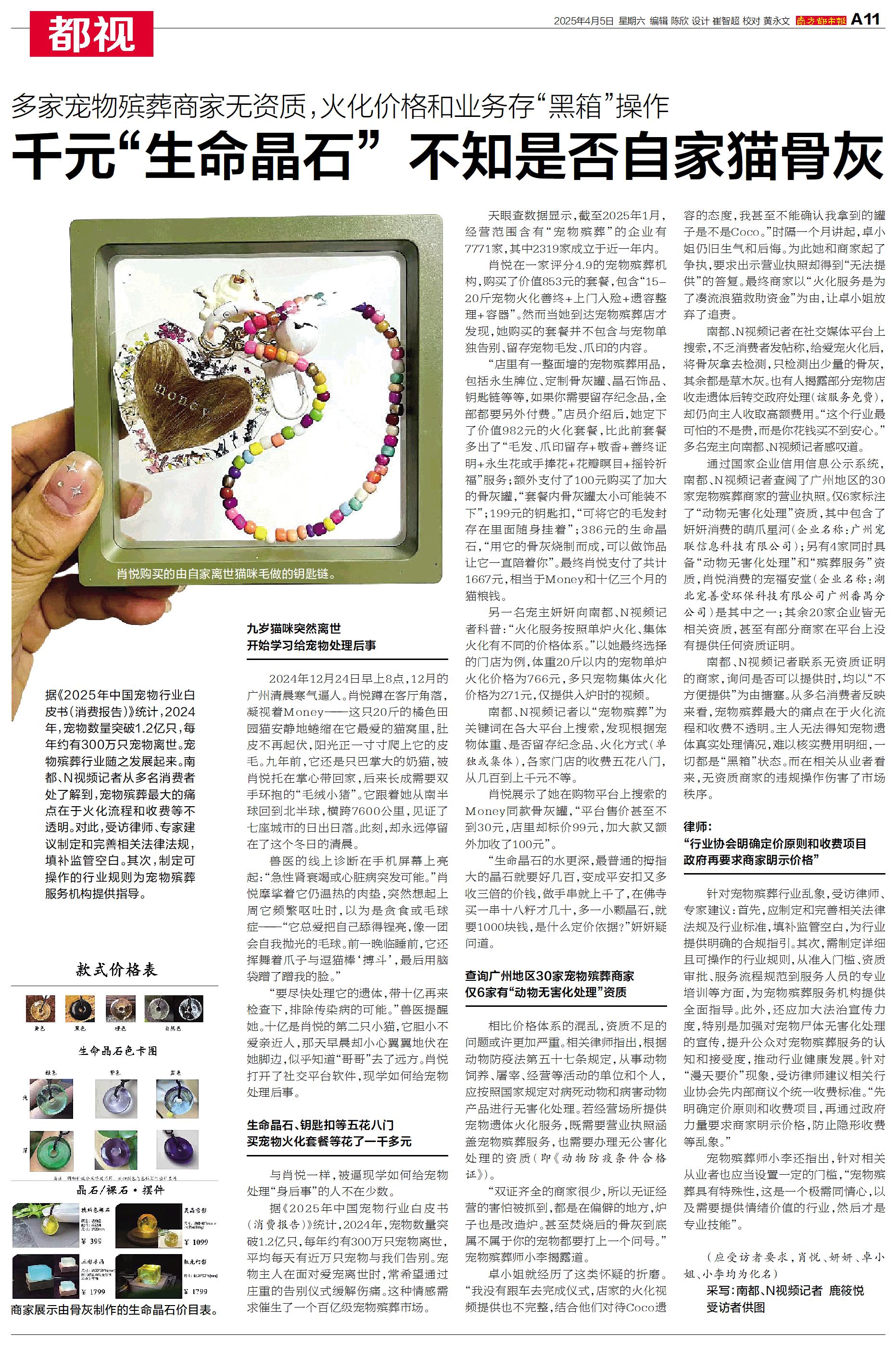 据《2025年中国宠物行业白皮书(消费报告)》统计,2024年,宠物数量突破1.2亿只,每年约有300万只宠物离世。宠物殡葬行业随之发展起来。南都、N视频记者从多名消费者处了解到,宠物殡葬最大的痛点在于火化流程和收费等不透明。对此,受访律师、专家建议制定和完善相关法律法规,填补监管空白。其次,制定可操作的行业规则为宠物殡葬服务机构提供指导。