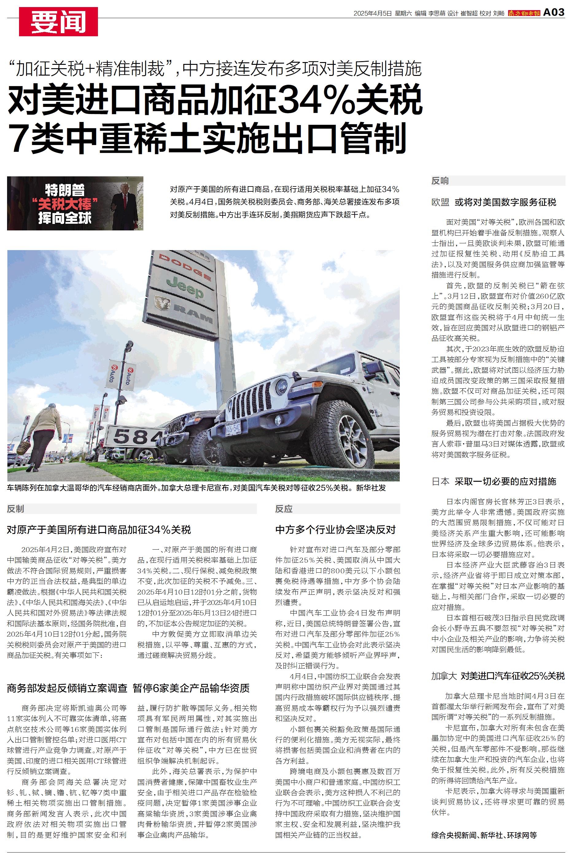 商务部会同海关总署决定对钐、钆、铽、镝、镥、钪、钇等7类中重稀土相关物项实施出口管制措施。商务部新闻发言人表示,此次中国政府依法对相关物项实施出口管制,目的是更好维护国家安全和利益,履行防扩散等国际义务。相关物项具有军民两用属性,对其实施出口管制是国际通行做法;针对美方宣布对包括中国在内的所有贸易伙伴征收“对等关税”,中方已在世贸组织争端解决机制起诉。