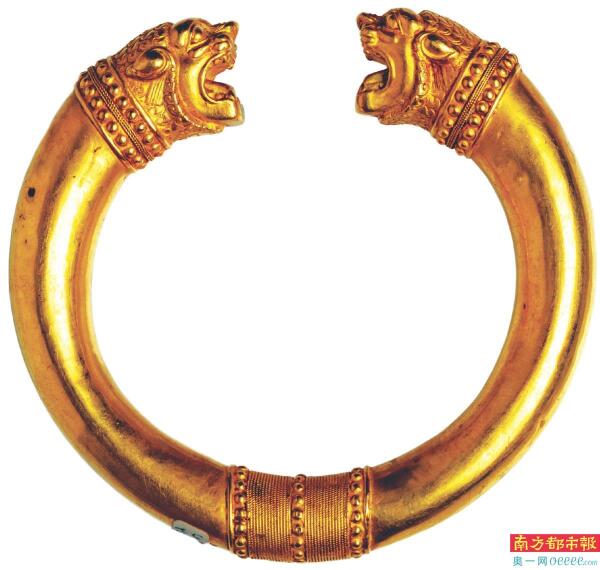 公元前550年,居鲁士称波斯王,建立了阿契美尼德王朝(公元前550年—公元前330年)。在国王大流士一世(公元前522年-公元前486年)统治时期,波斯帝国达到鼎盛时期,成为世界上第一个地跨亚、非、欧三大洲的帝国。阿契美尼德王朝时期艺术融合了埃及、亚述、巴比伦文明,构建出波斯文明。这件黄金狮首授权环正是阿契美尼德王朝时期的文物。