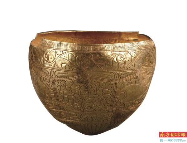萨珊王朝花叶鸟鱼纹窝形金器。