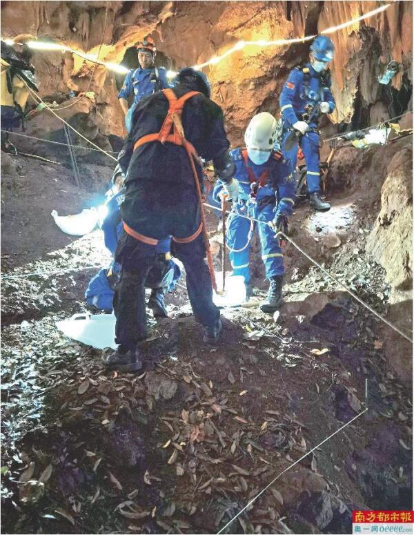 李法军及团队在90余米深的洞穴中挖掘红军烈士遗骸。 受访者供图