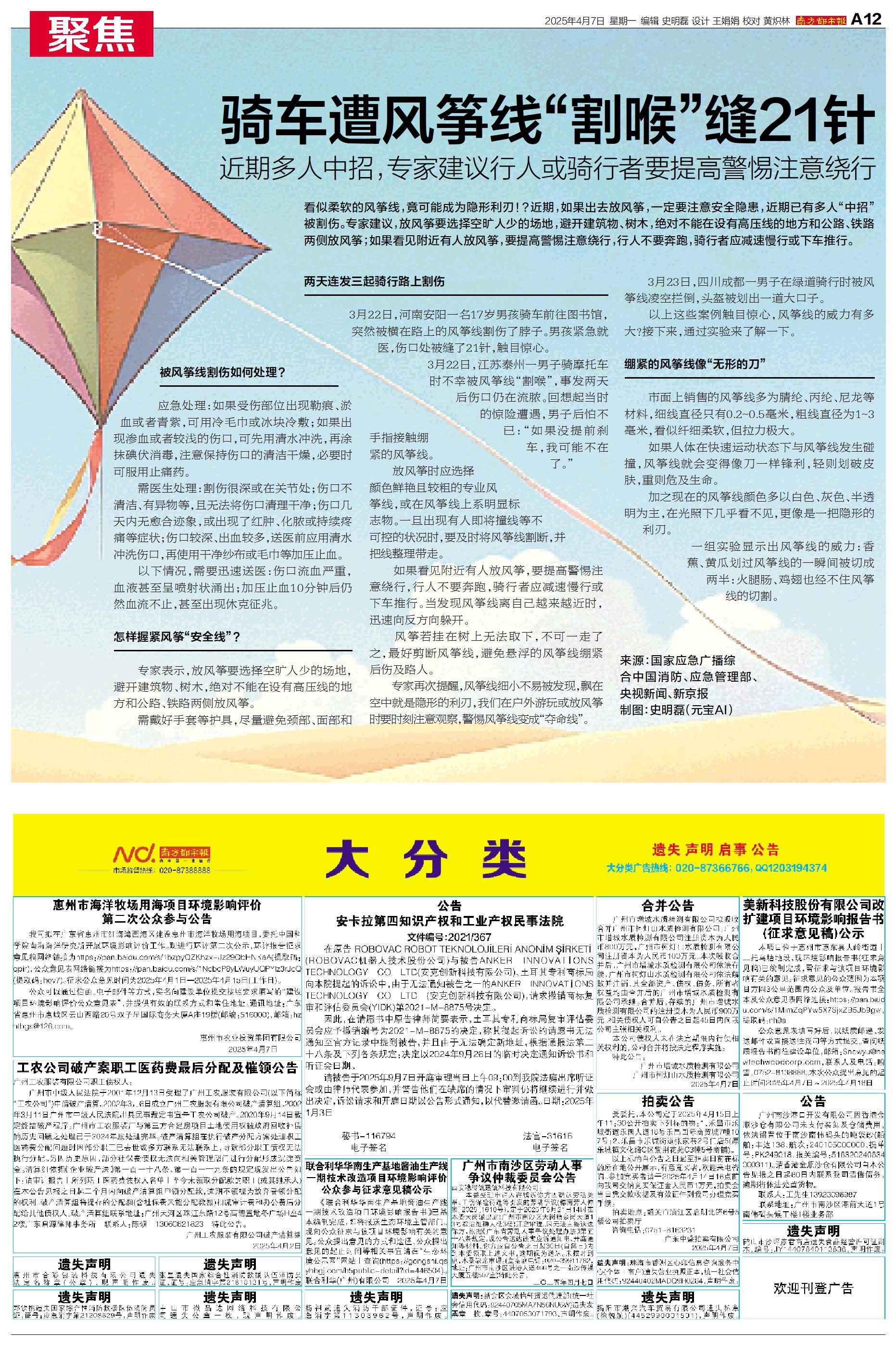 近期,如果出去放风筝,一定要注意安全隐患,近期已有多人“中招”被割伤。