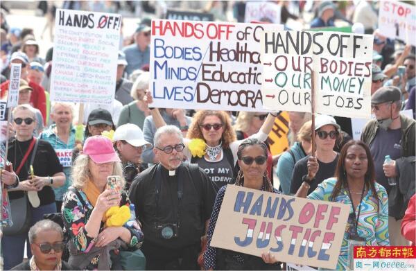在华盛顿就读本科的中国留学生宜婷(化名)也向南都记者表示,4月5日抗议活动当天,许多人冒着小雨涌到华盛顿纪念碑周围的大片草地前举牌抗议。抗议的牌子上写着“企鹅反对关税”“把马斯克送上火星”等,还有民众高喊“特朗普下台”,要求“保护美国宪法”“不要干涉公民权利”。