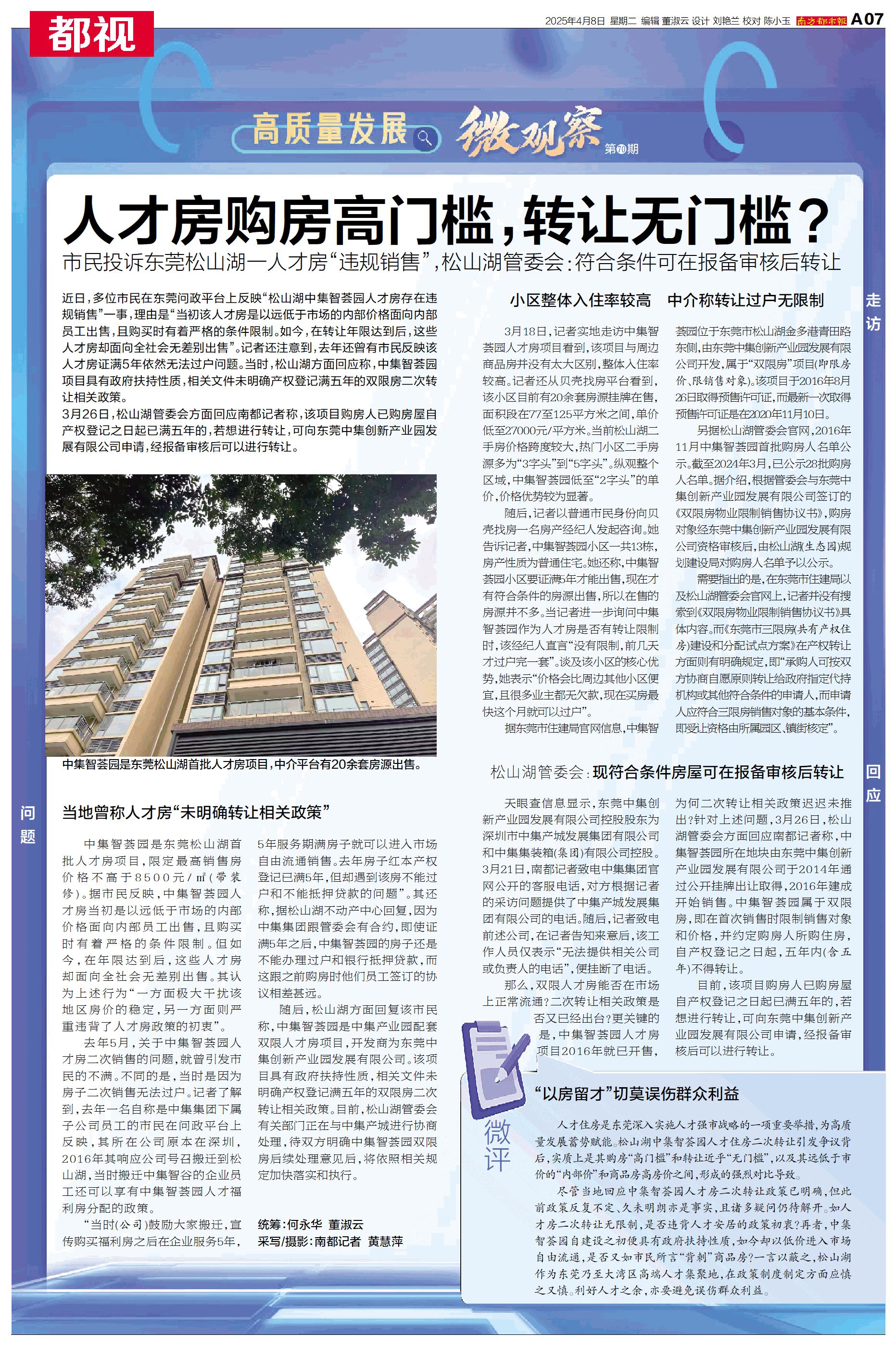 近日,多位市民在东莞问政平台上反映“松山湖中集智荟园人才房存在违规销售”一事,理由是“当初该人才房是以远低于市场的内部价格面向内部员工出售,且购买时有着严格的条件限制。