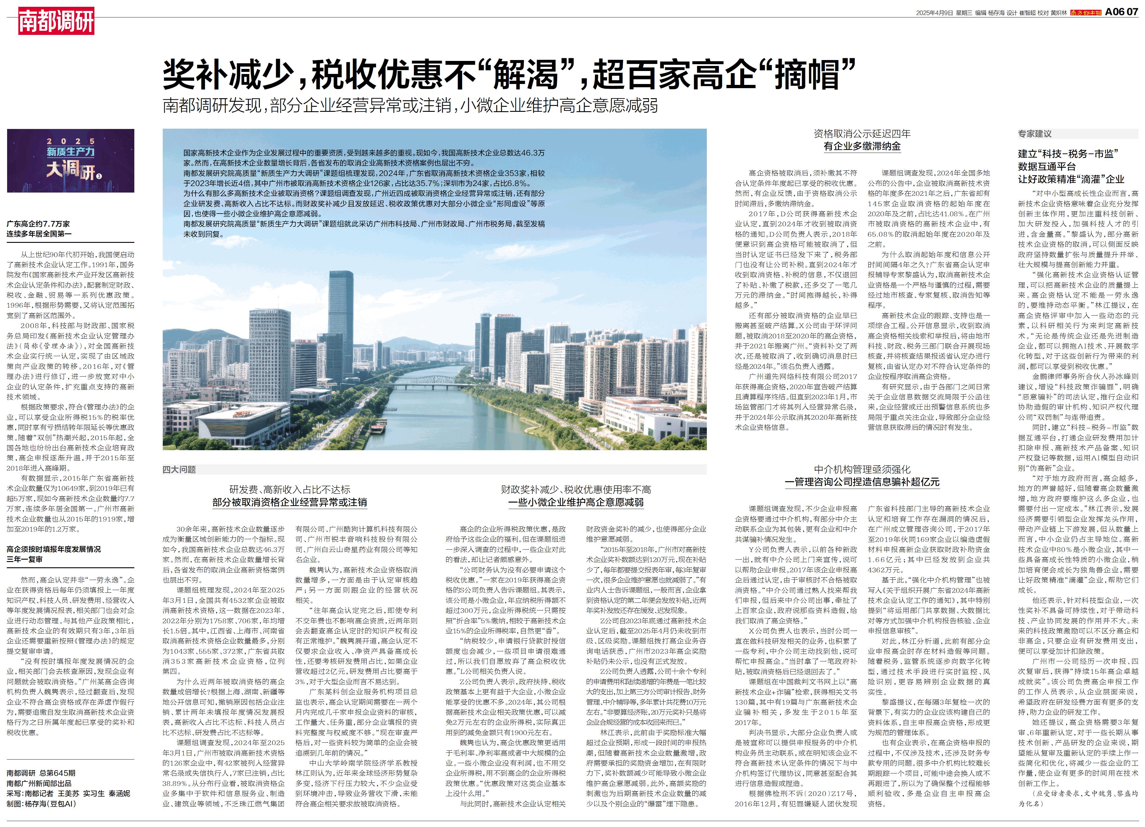 南都高质量发展研究院“新质生产力大调研”课题组就此采访广州市科技局、广州市财政局、广州市税务局,截至发稿未收到回复。