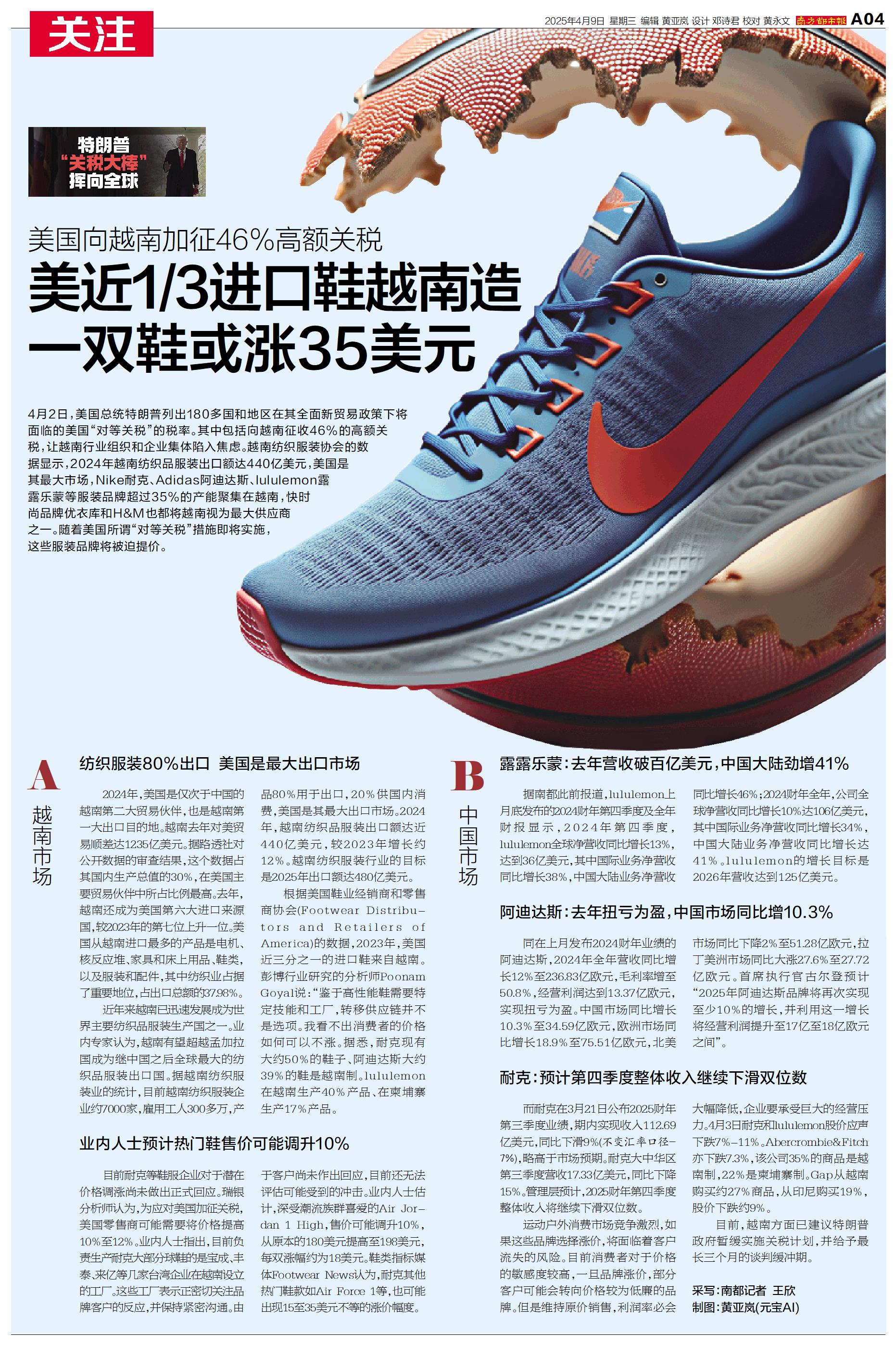 美近1/3进口鞋越南造 一双鞋或涨35美元