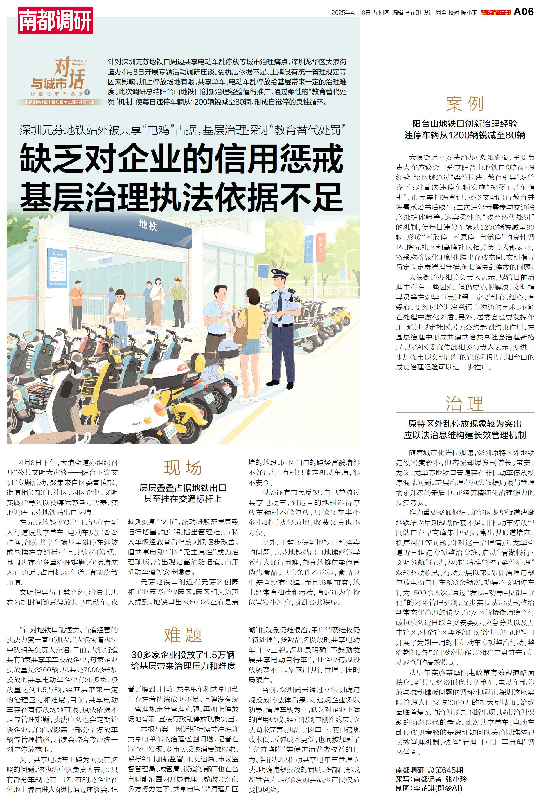 针对深圳元芬地铁口周边共享电动车乱停放等城市治理痛点,深圳龙华区大浪街道办4月8日开展专题活动调研座谈。