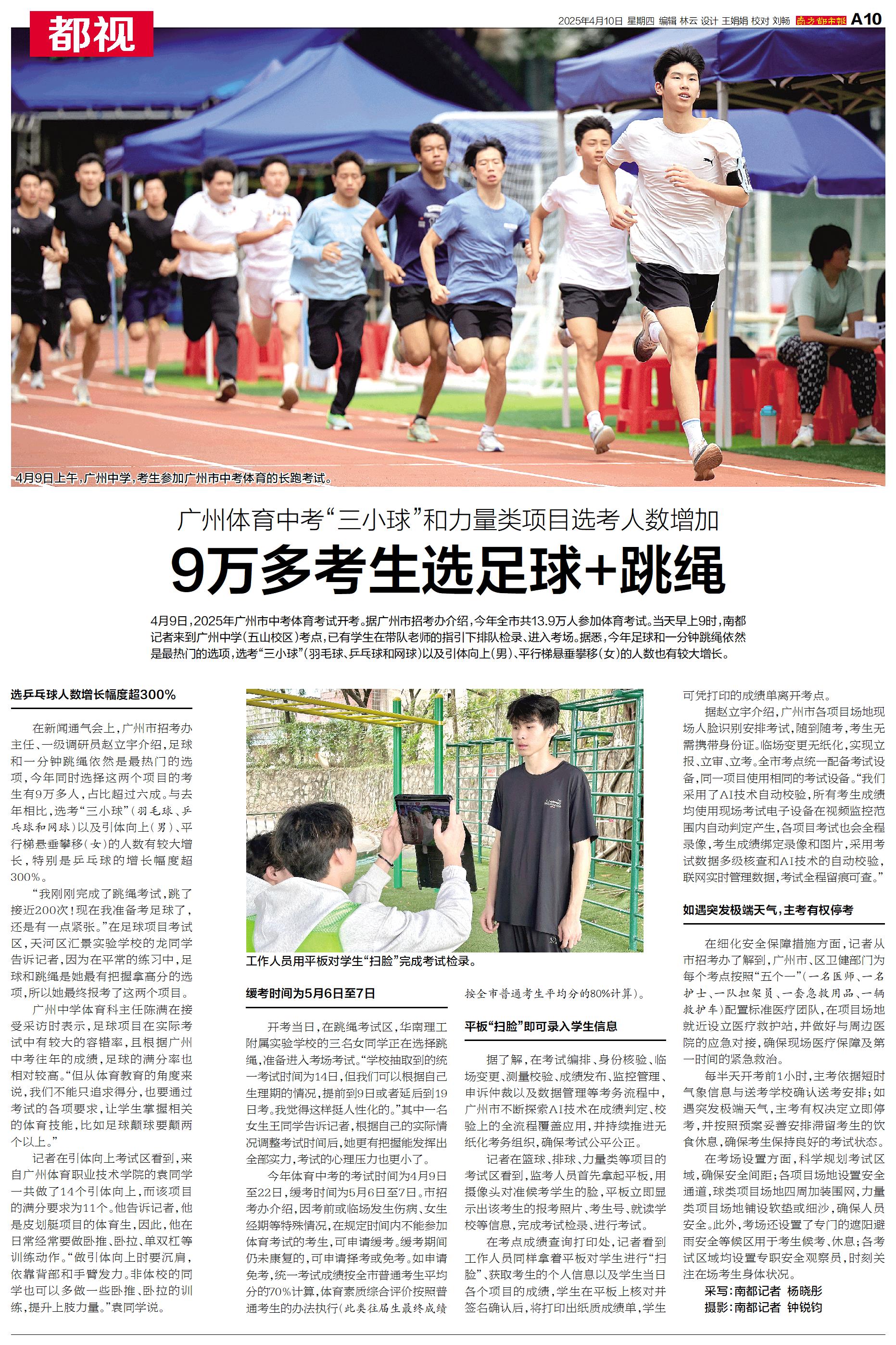 4月9日,2025年广州市中考体育考试开考。据广州市招考办介绍,今年全市共13.9万人参加体育考试。
