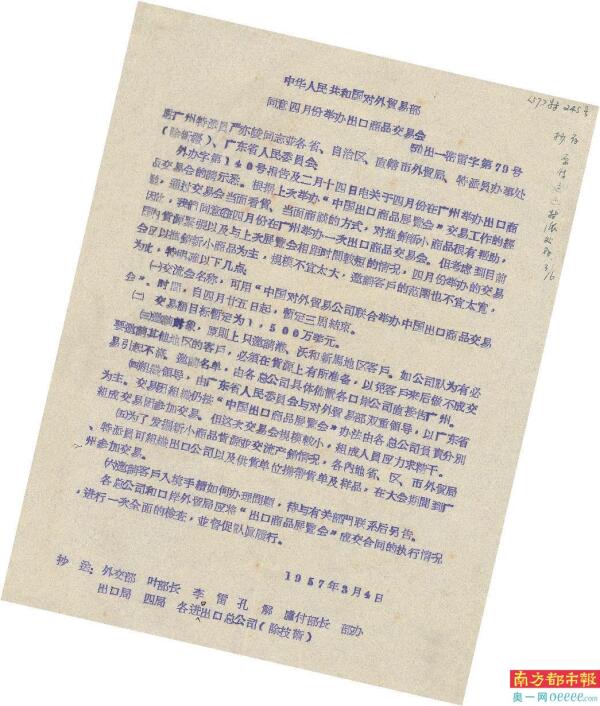 1957年3月4日,《中华人民共和国对外贸易部同意四月份举办出口商品交易会》下发。4月25日,酝酿已久的第一届中国出口商品交易会在广州拉开帷幕。党中央、国务院高度重视、十分关心,周总理亲临开幕现场视察。