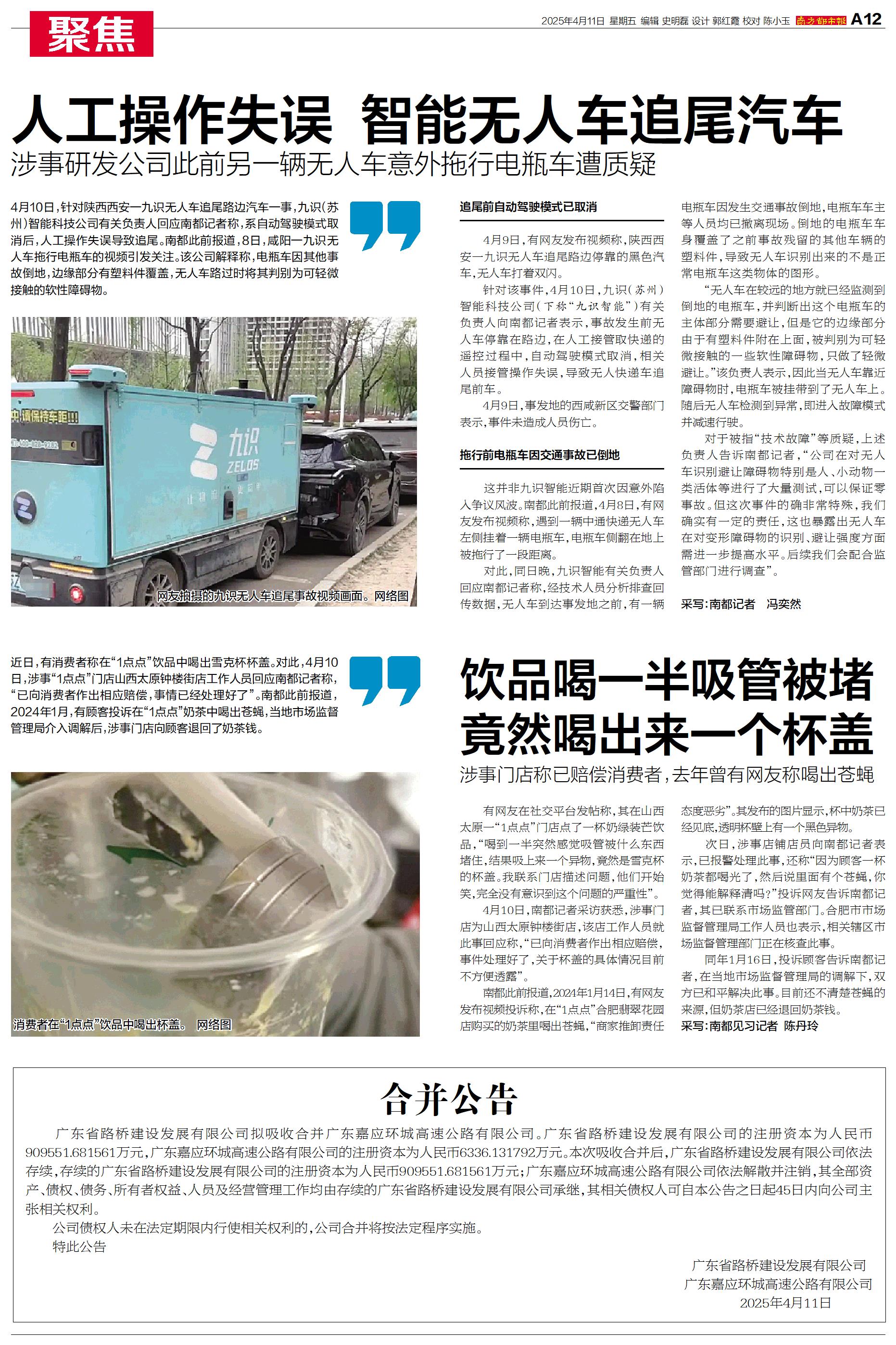 4月10日,针对陕西西安一九识无人车追尾路边汽车一事,九识(苏州)智能科技公司有关负责人回应南都记者称,系自动驾驶模式取消后,人工操作失误导致追尾。