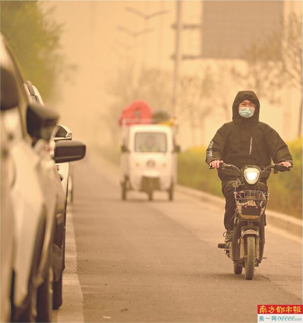 4月11日,宁夏石嘴山市、银川市、吴忠市、中卫市出现强沙尘暴天气,市民骑车出行。 新华社发