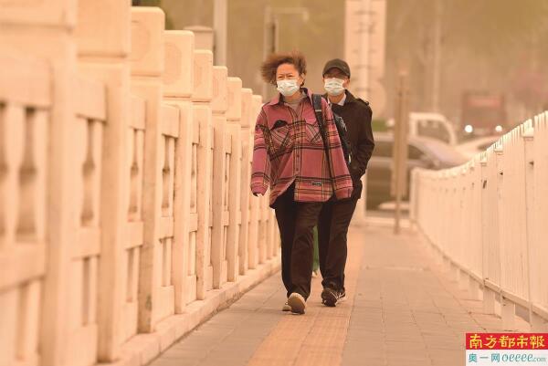 4月11日,在银川市街头,市民在强沙尘暴天气中行走。新华社发