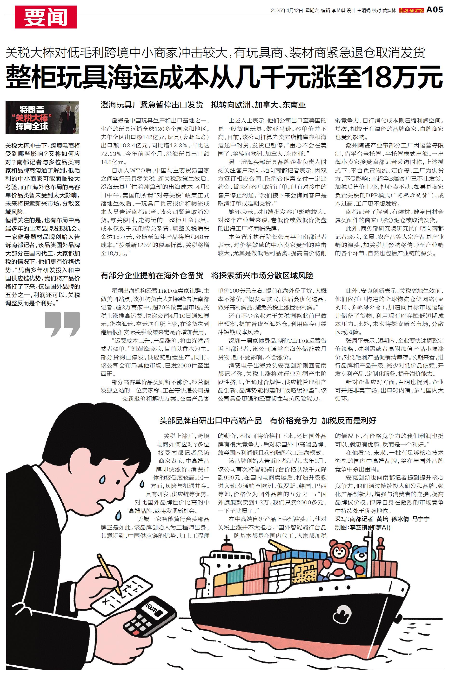 南都记者与多位品类商家和品牌商沟通了解到,低毛利的中小商家可能面临较大考验,而在海外仓布局的高客单价品类暂未受到太大影响,未来将探索新兴市场,分散区域风险。