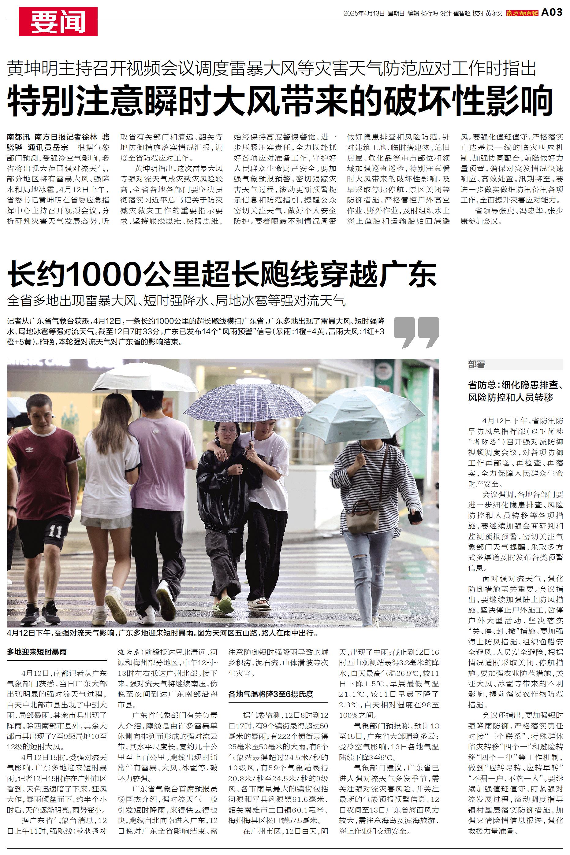 记者从广东省气象台获悉,4月12日,一条长约1000公里的超长飑线横扫广东省,广东多地出现了雷暴大风、短时强降水、局地冰雹等强对流天气。