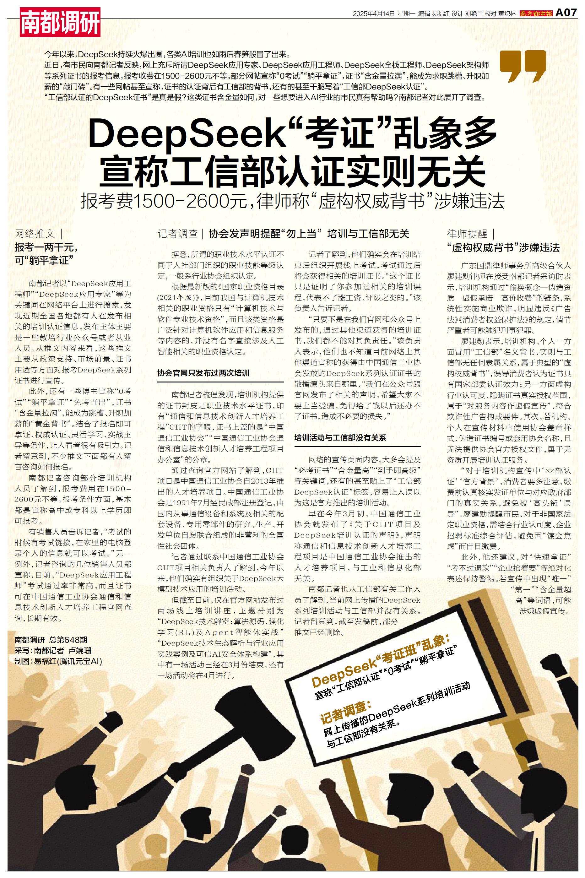 “工信部认证的DeepSeek证书”是真是假?这类证书含金量如何,对一些想要进入AI行业的市民真有帮助吗?南都记者对此展开了调查。