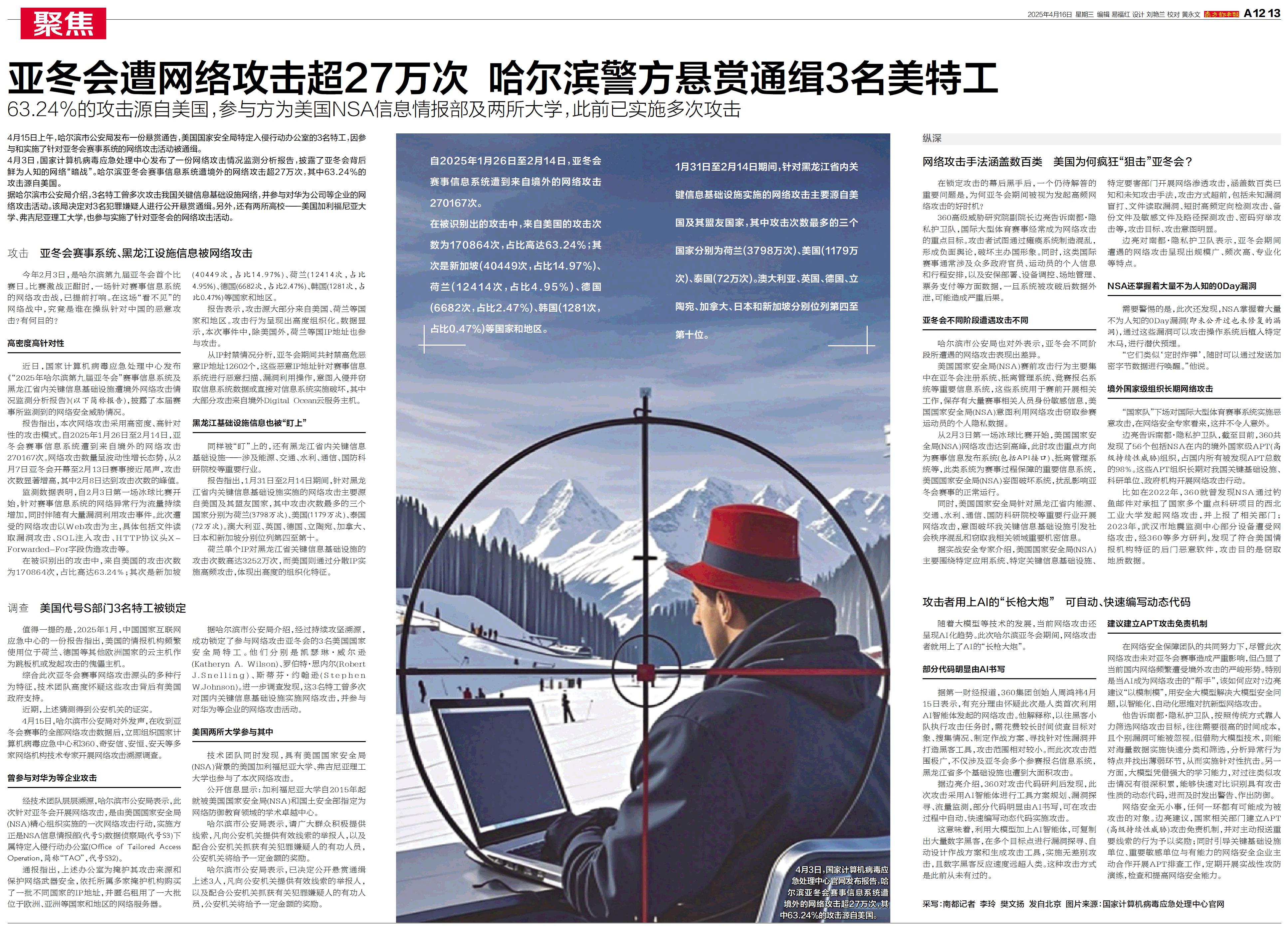 亚冬会遭网络攻击超27万次 哈尔滨警方悬赏通缉3名美特工