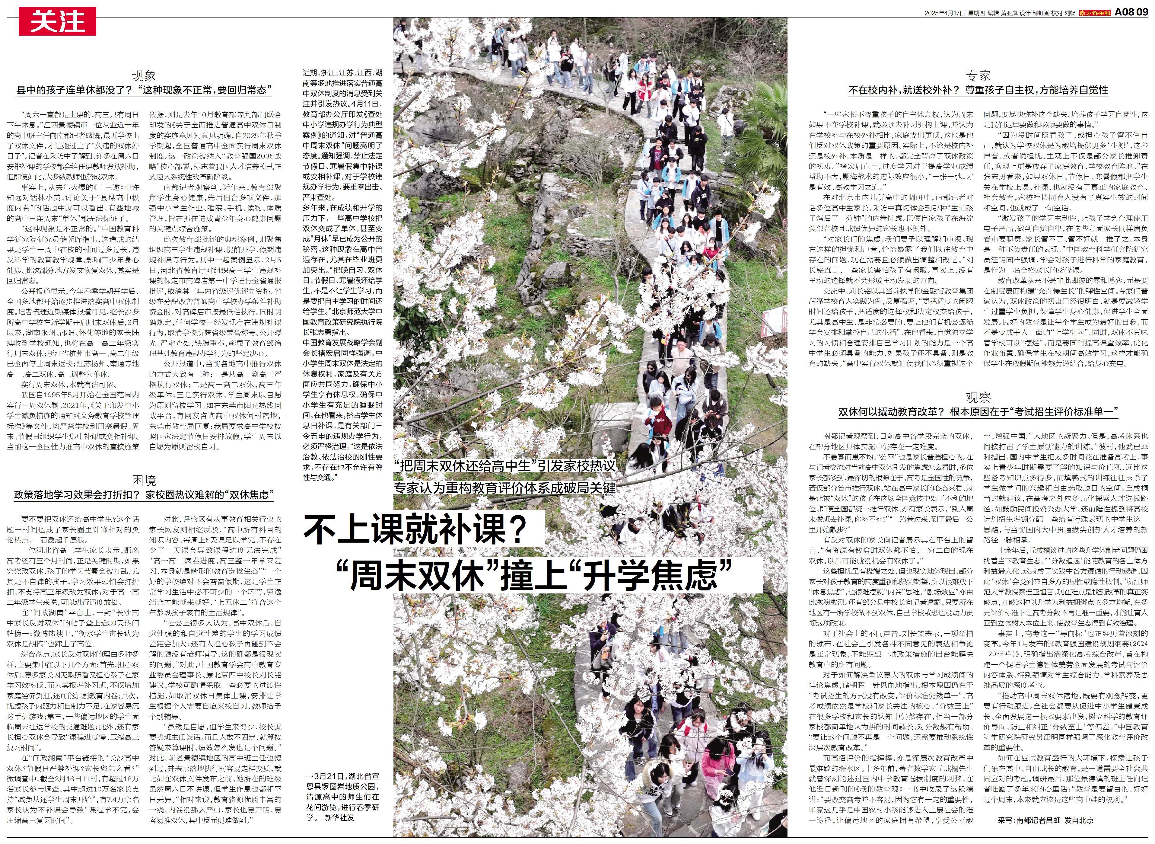 教育改革从来不是非此即彼的零和博弈,而是要在制度层面构建“允许慢生长”的弹性空间。专家们普遍认为,双休政策的初衷已经很明白,就是要减轻学生过重学业负担,保障学生身心健康,促进学生全面发展。良好的教育是让每个学生成为最好的自我,而不是变成千人一面的“上学机器”。同时,双休不意味着学校可以“摆烂”,而是要同时提高课堂效率,优化作业布置,确保学生在校期间高效学习,这样才能确保学生在放假期间能够劳逸结合,给身心充电。