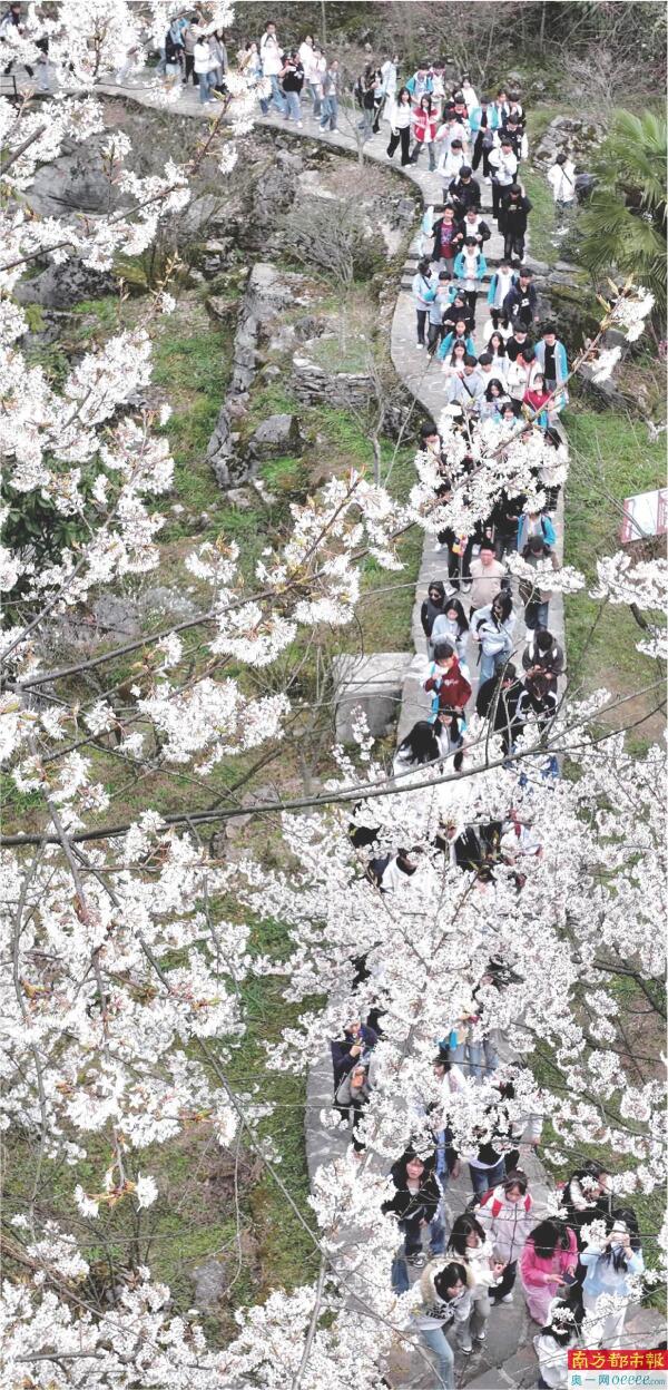 3月21日,湖北省宣恩县锣圈岩地质公园,清源高中的师生们在花间游览,进行春季研学。 新华社发