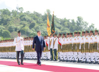 4月16日上午,马来西亚最高元首易卜拉欣在马来西亚国家王宫同中国国家主席习近平举行会见。