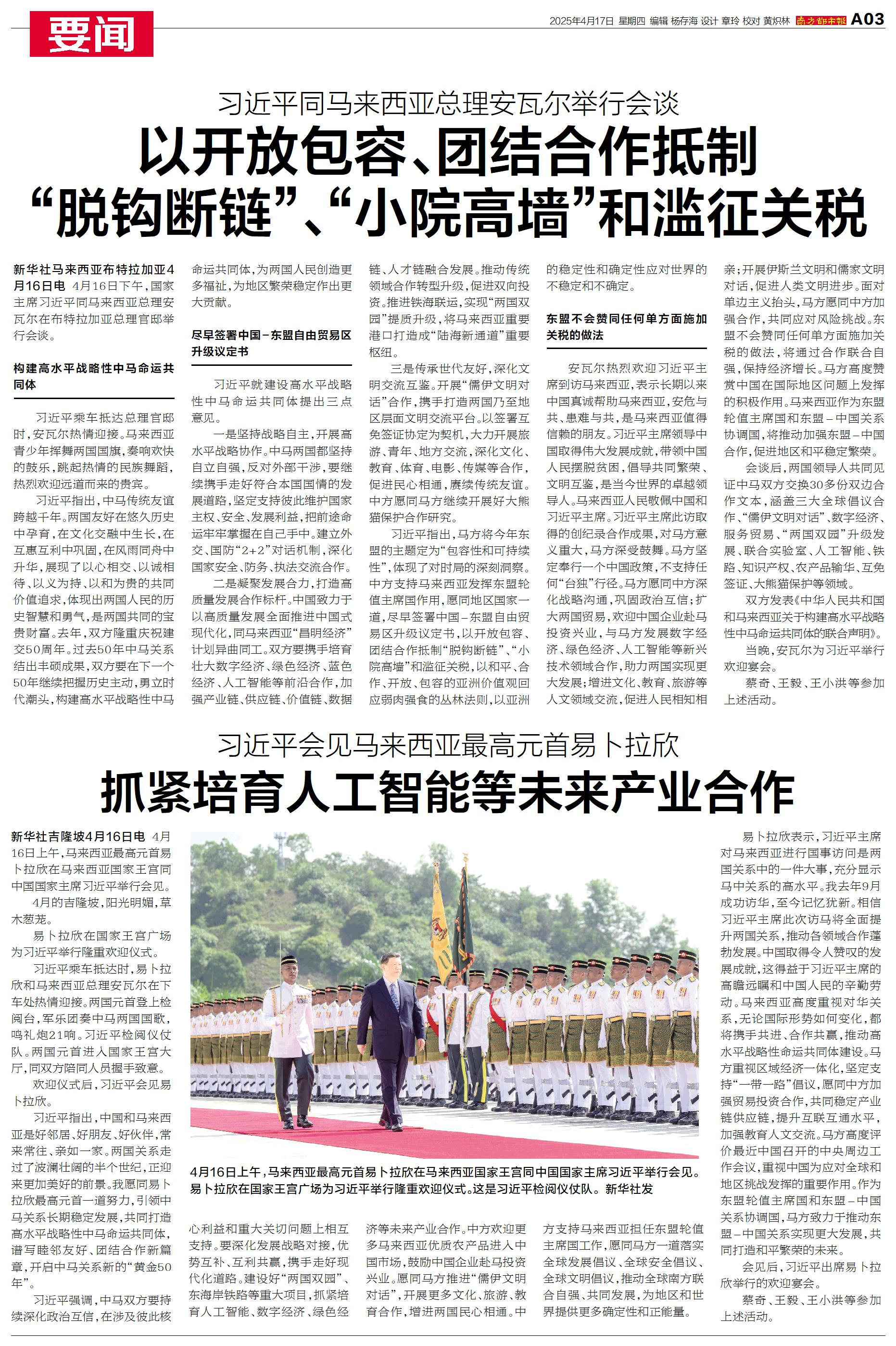4月16日下午,国家主席习近平同马来西亚总理安瓦尔在布特拉加亚总理官邸举行会谈。