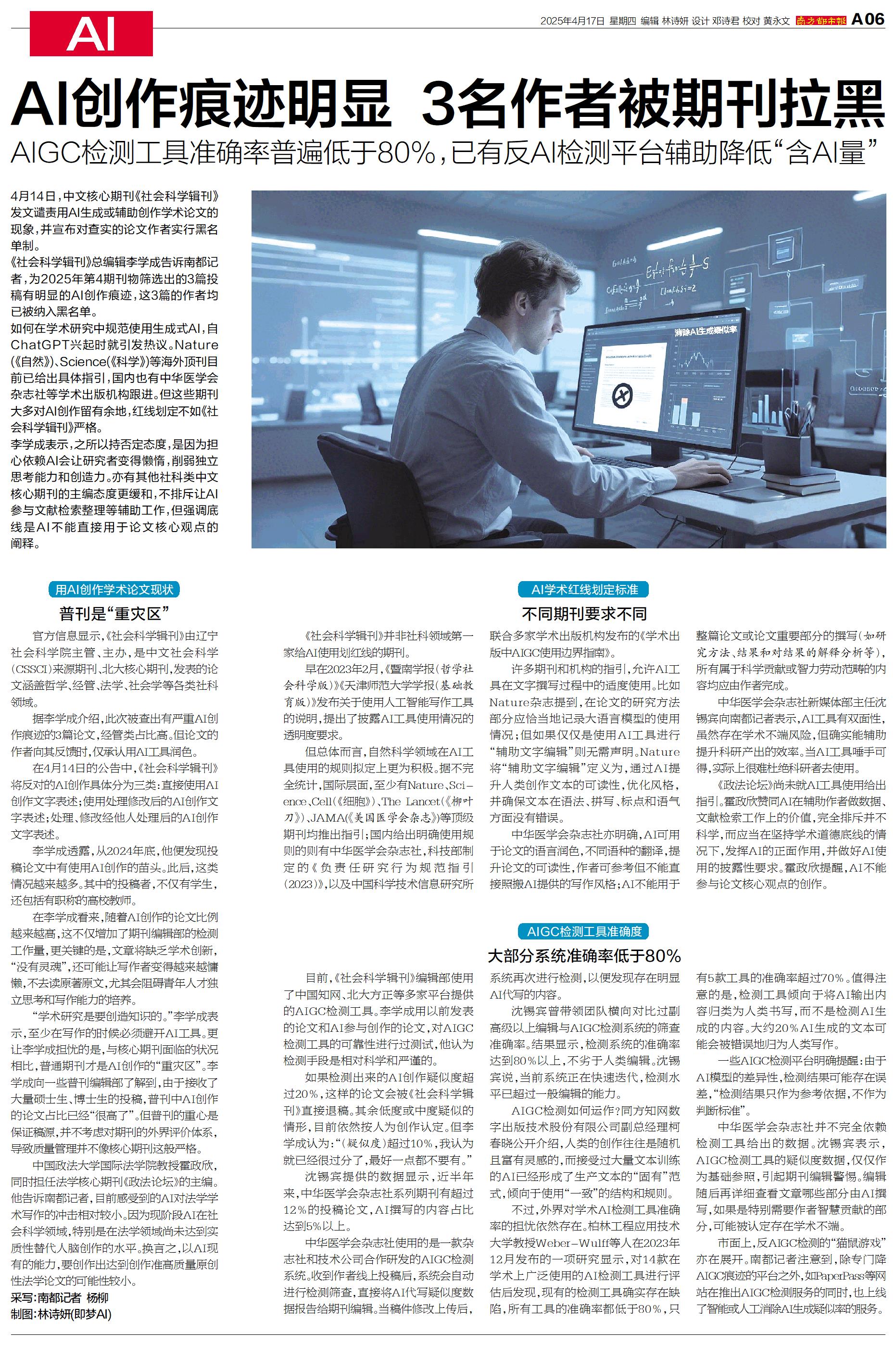 4月14日,中文核心期刊《社会科学辑刊》发文谴责用AI生成或辅助创作学术论文的现象,并宣布对查实的论文作者实行黑名单制。