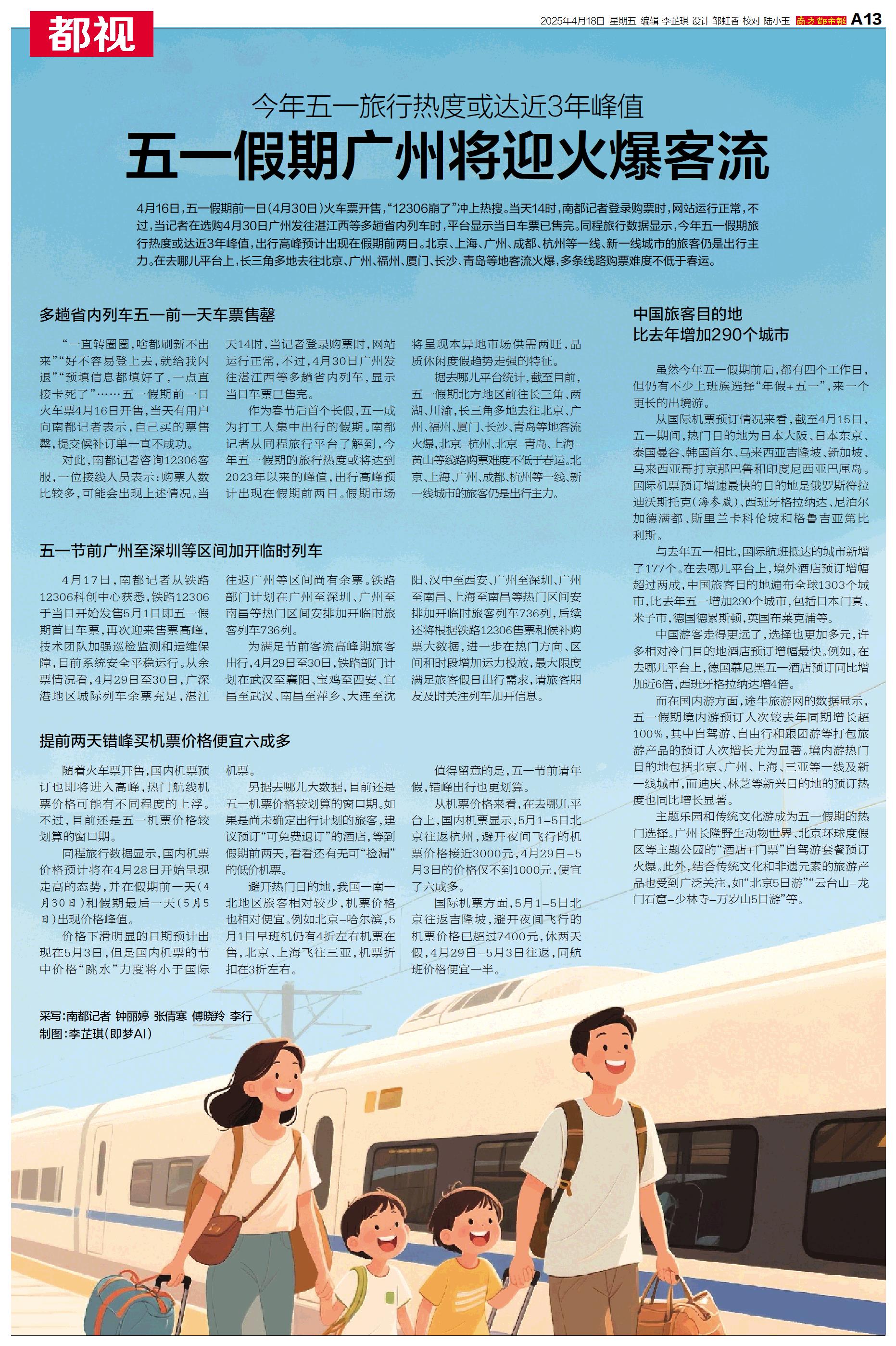 4月16日,五一假期前一日(4月30日)火车票开售,“12306崩了”冲上热搜。当天14时,南都记者登录购票时,网站运行正常,不过,当记者在选购4月30日广州发往湛江西等多趟省内列车时,平台显示当日车票已售完。同程旅行数据显示,今年五一假期旅行热度或达近3年峰值,出行高峰预计出现在假期前两日。北京、上海、广州、成都、杭州等一线、新一线城市的旅客仍是出行主力。在去哪儿平台上,长三角多地去往北京、广州、福州、厦门、长沙、青岛等地客流火爆,多条线路购票难度不低于春运。